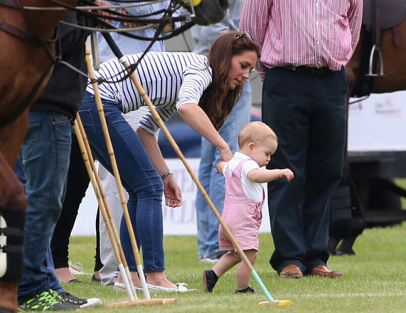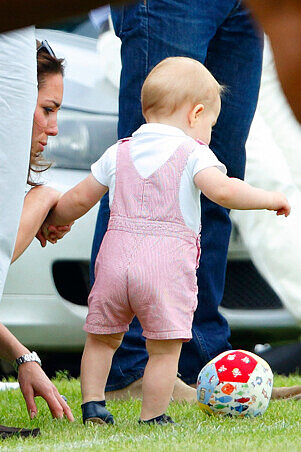 雖然凱特王妃這天輕便的穿上大家看過很多次的休閒服,但頭髮完美的髮質和捲度還是擋不住她的皇家氣勢。而小王子這次則是穿著美國平價品牌Neck & Neck 價值台幣約1500元的粉紅色條紋吊帶褲配上Polo衫,還在學走路的他穿上這套夏天味十足又可愛的外出服,似乎當場全部的攝影機都瞄準了站在場邊的凱特和喬治,又把老爸威廉王子的版面給搶光了!