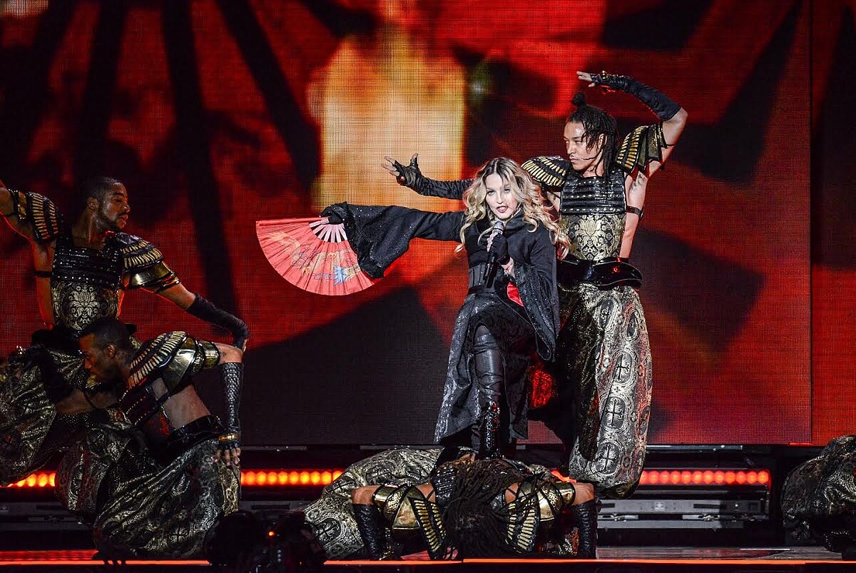 瑪丹娜身著紅色改良和服演唱”Bitch I’m Madonna我是女皇”,手持紅扇與舞者軋舞,並接著演唱”Burning up燃燒”,女皇改拿電吉他自彈自唱,甚至還跪下與台下歌迷近距離互動,更情不自禁的與台灣歌迷打招呼,大喊「台灣準備好了嗎?台北與我同在嗎?」台下歌迷全場嗨翻天,熱情回應女皇的召喚,娜姊也開心的用中文說出「你好台北,謝謝!」,誠意破表。