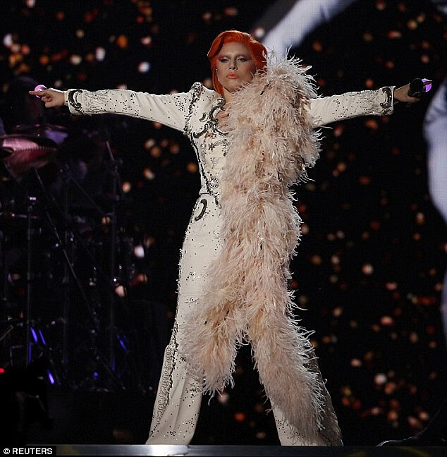 女神卡卡Lady Gaga向已逝的大衛鮑伊致敬的一連串經典演唱,從《Space Oddity》、《Changes》、Ziggy Stardust》、《Suffragette City》、 《Rebel Rebel》、《Fashion》、《Fame》、《Under Pressure》、《Let's Dance》到《Heroes》長達6分鐘,成了表演中的最大高潮之一,獲得全場拍手叫好,而日前在典禮前,她還將大衛鮑伊刺在身上左側表作紀念。