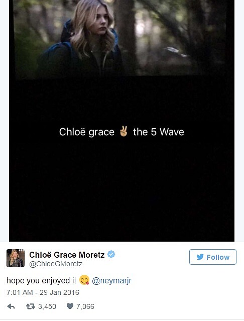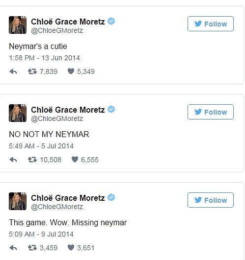 而其實克蘿伊老早就是內馬爾的頭號粉絲,早在2014年世界盃足球賽期間,克蘿伊就曾好幾次在Twitter上表示好感,寫下:「內馬爾好可愛。」、「想念我的內馬爾。」在2016年年初她更直接標記內馬爾,希望他去看她的新電影《第5毀滅》,互動貌似相當緊密。