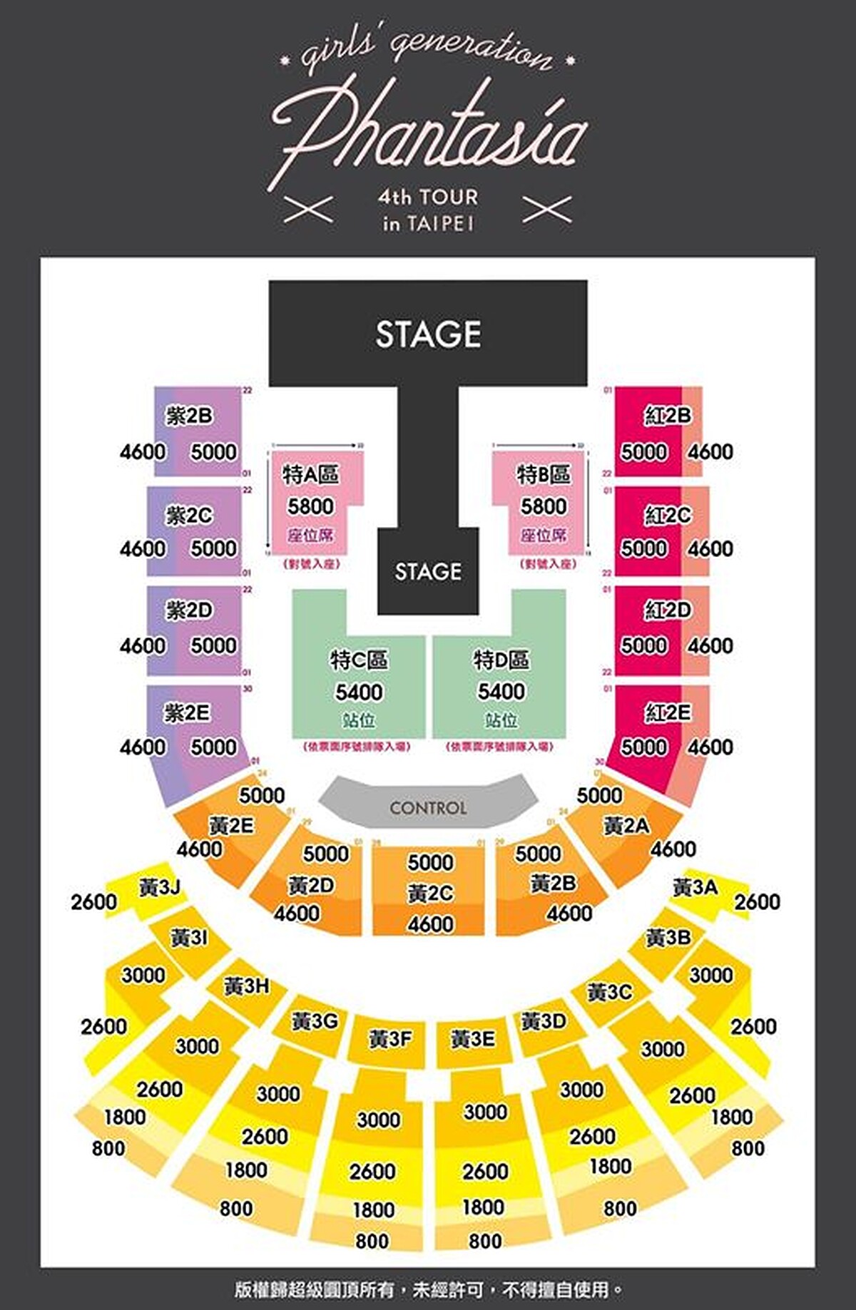 票價:$5,800/$5,400/$5,000/$4,600 /$3,000 / $2,600 / $1,800 / $800