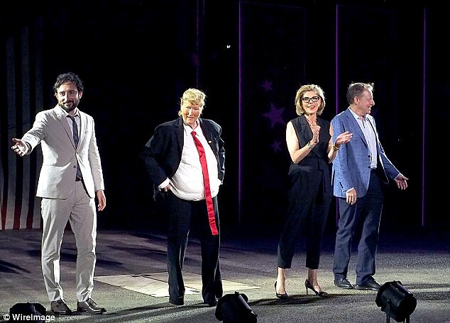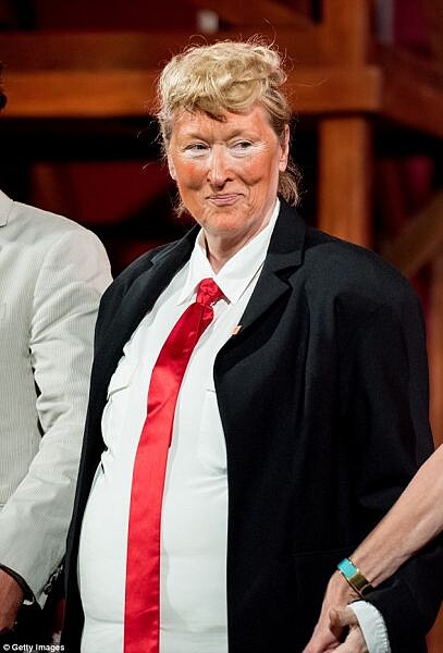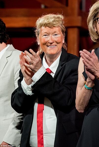日前她在紐約德拉寇特劇院Delacorte Theater,戴起金色假髮,穿上西裝和紅領帶,不只將臉畫得超橘,那個啤酒肚更是大的可以,完美反串川普的經典造型,可將在場眾人逗得哈哈大笑,而女星克莉絲汀巴倫絲基Christine Baranski則是巧扮希拉蕊,兩人還一同演唱音樂劇《刁蠻公主》的名曲,其中一句「你讓我知道,為何所有女人都說不」,身為希拉蕊支持者的她,這回更是直接大肆調侃川普。