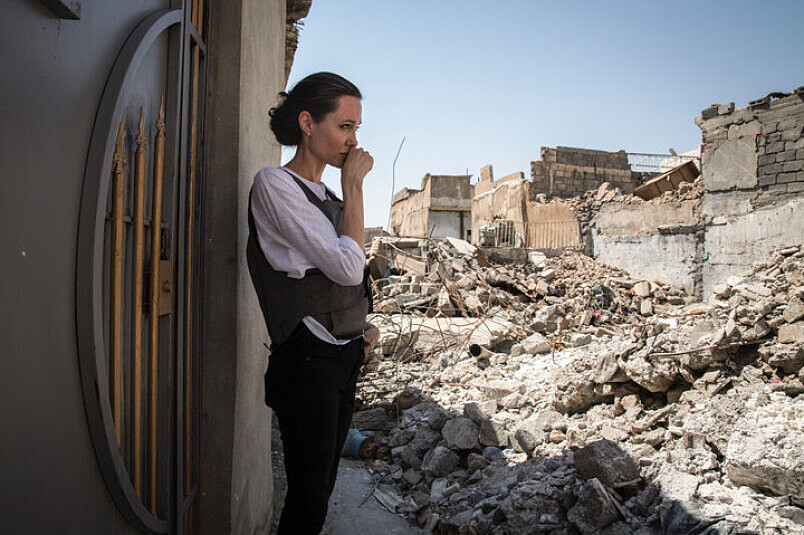 伊拉克政府在2017年從ISIS手中奪回摩蘇爾,在此之前,ISIS佔據摩蘇爾長達3年間,成為根據地大本營,期間至少造成90萬的難民外逃。在聯合國難民署(NUHCR)公布的影片中,可以看見裘莉走過傾頹的城市,並慰問難民。經過ISIS的摧殘,整個城市幾乎全毀,恢復進度緩慢。