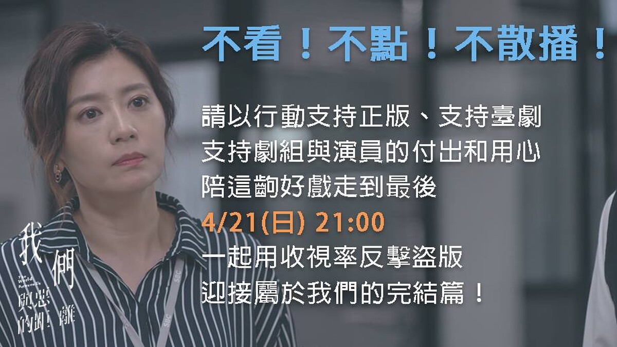 話題台劇《我們與惡的距離》連續播出4週後話題依然火熱,4月21日即將迎來大結局,不料正在大家保持著每周日收看的樂趣時,竟然有盜版的9、10兩集已經在網路上流出,讓公視、HBO asia、Catchplay等播出發行頻道感到意外與震怒,當然同時也影響到了追劇者的心情。三家平台目前發表聯合聲明,呼籲大家不要看盜版,把持到最後,一起享受追劇的樂趣。各位劇迷,請堅守不看、不點以及不散播的原則,一起陪著所有演員走到最後吧!