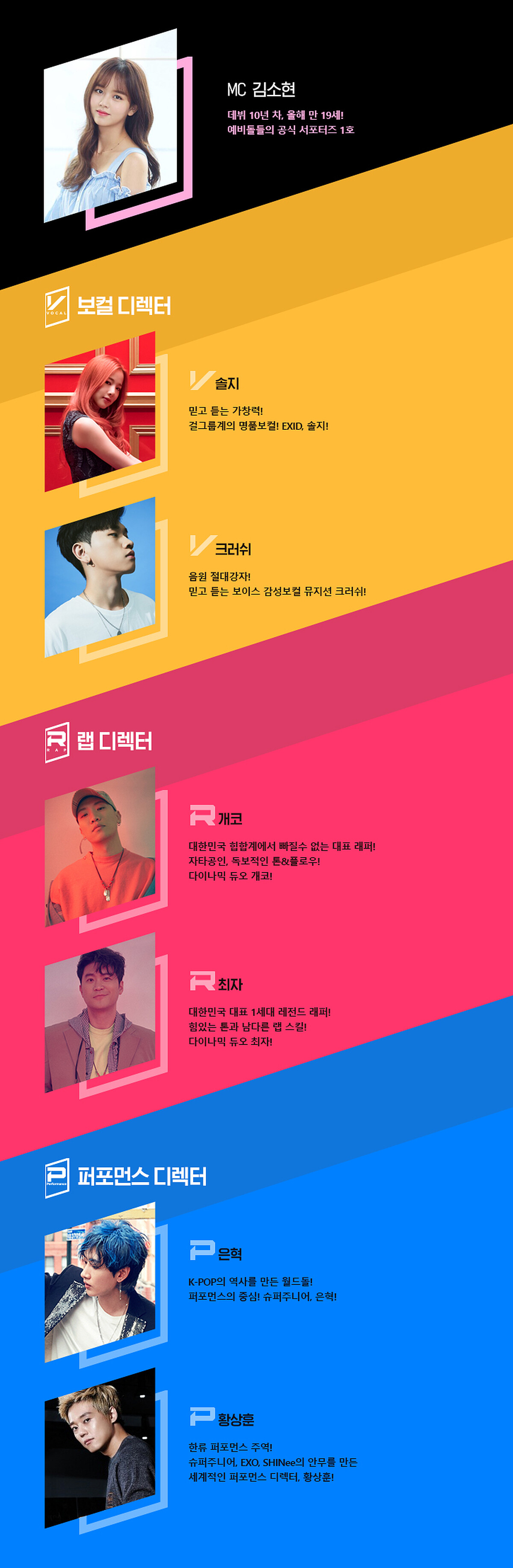 而節目的導師陣容也相當堅強,包括EXID率智、Crush擔任歌唱指導,Rap找來 Dynamic Duo,Performance部分則是Super Junior 銀赫與 S.M. Entertainment 御用編舞家黃尚勳,另外東方神起成員鄭允浩將擔任特別指導人,主持人則由童星出身的金所炫擔綱。