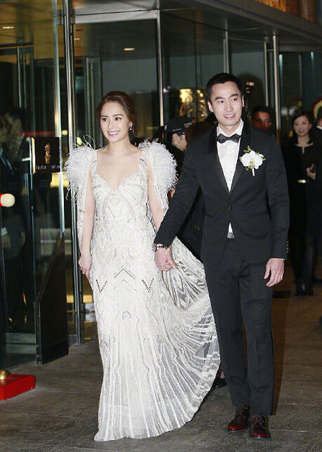 今年5月才在洛杉磯舉行小型婚前派對,日前回到香港登記,選在12月20日於香港麗思卡爾頓酒店舉行婚禮,阿嬌受訪時表示自己已經習慣被叫賴太太了,一直以來也都稱賴弘國為老公,今天她身穿低胸羽毛婚紗小露性感,兩人也大方幸福相吻。