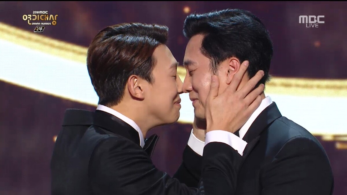 劇中蘇志燮不只是超MAN情報員,還是兩個小孩的保姆,除了和孩子們有鼻鼻之吻,沒想到最強綠葉姜其永也和歐巴有鼻鼻互動,這回憑劇拿下大獎,蘇志燮可是依照約定,在台上和姜其永重演鼻鼻親親,蘇志燮最後還害羞的臉紅,完全滿足許多腐女們的內心。