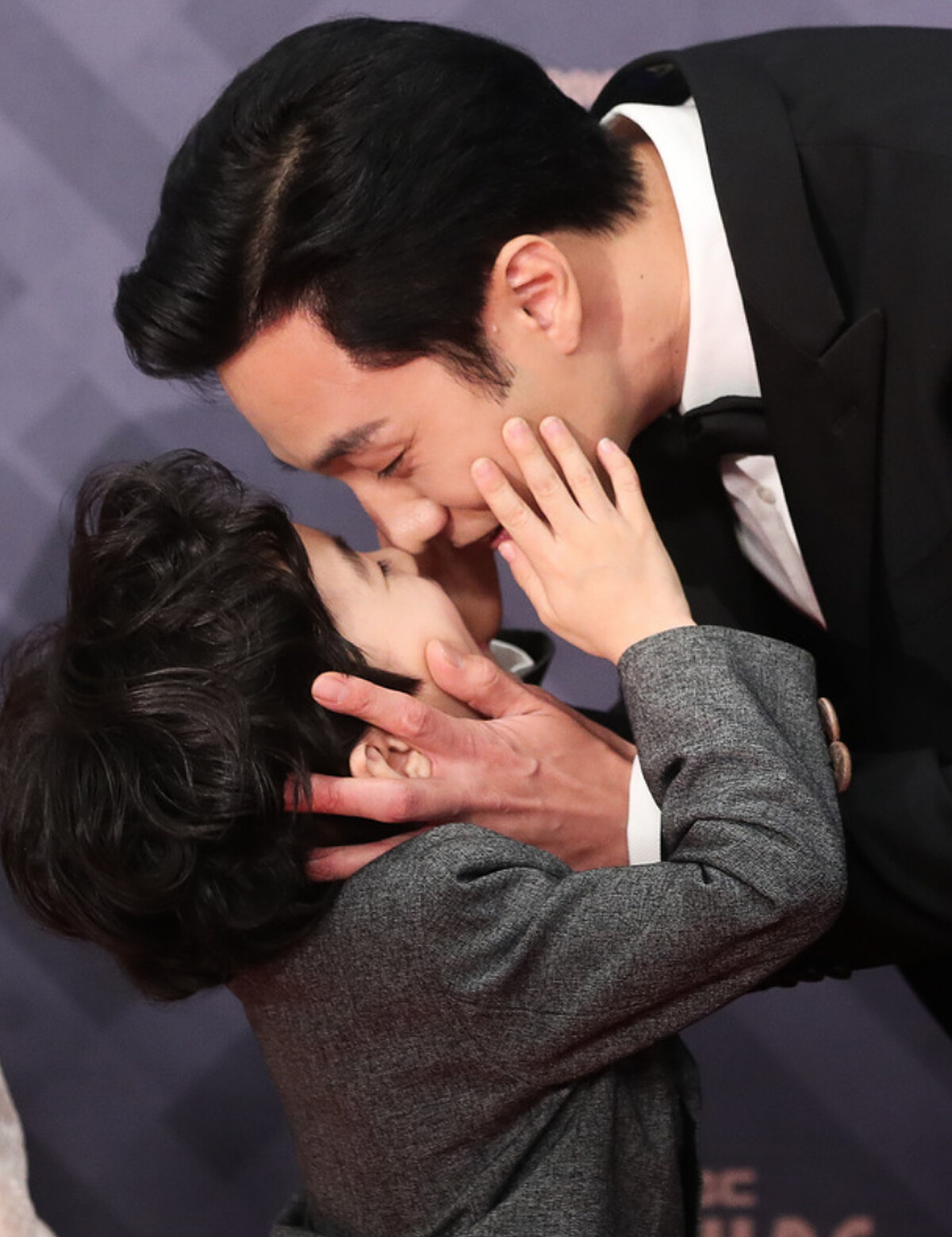 而在走紅毯時,蘇志燮牽著「俊俊」雙胞胎中的小童星「俊秀」金建宇走紅毯,一樣也和俊秀來一段鼻鼻親親,畫面可是萌到不行。