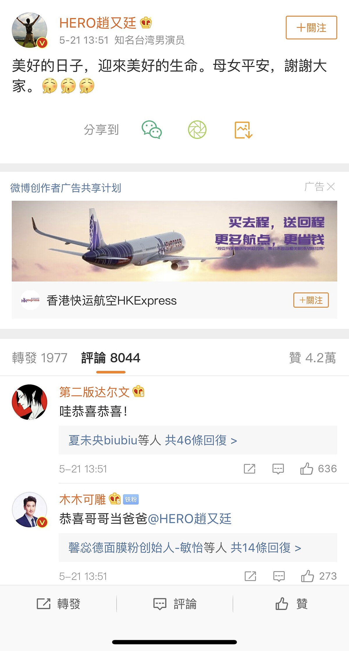 今年34歲的Mark趙又廷,2014年和高圓圓結婚至今5年,現在終於再度傳出喜事,宣佈老婆高圓圓生下女兒,趙又廷本人也在微博證實消息,寫下:「美好的日子,迎來美好的生命。母女平安,謝謝大家。」