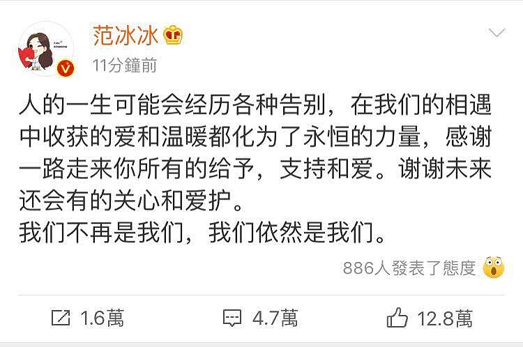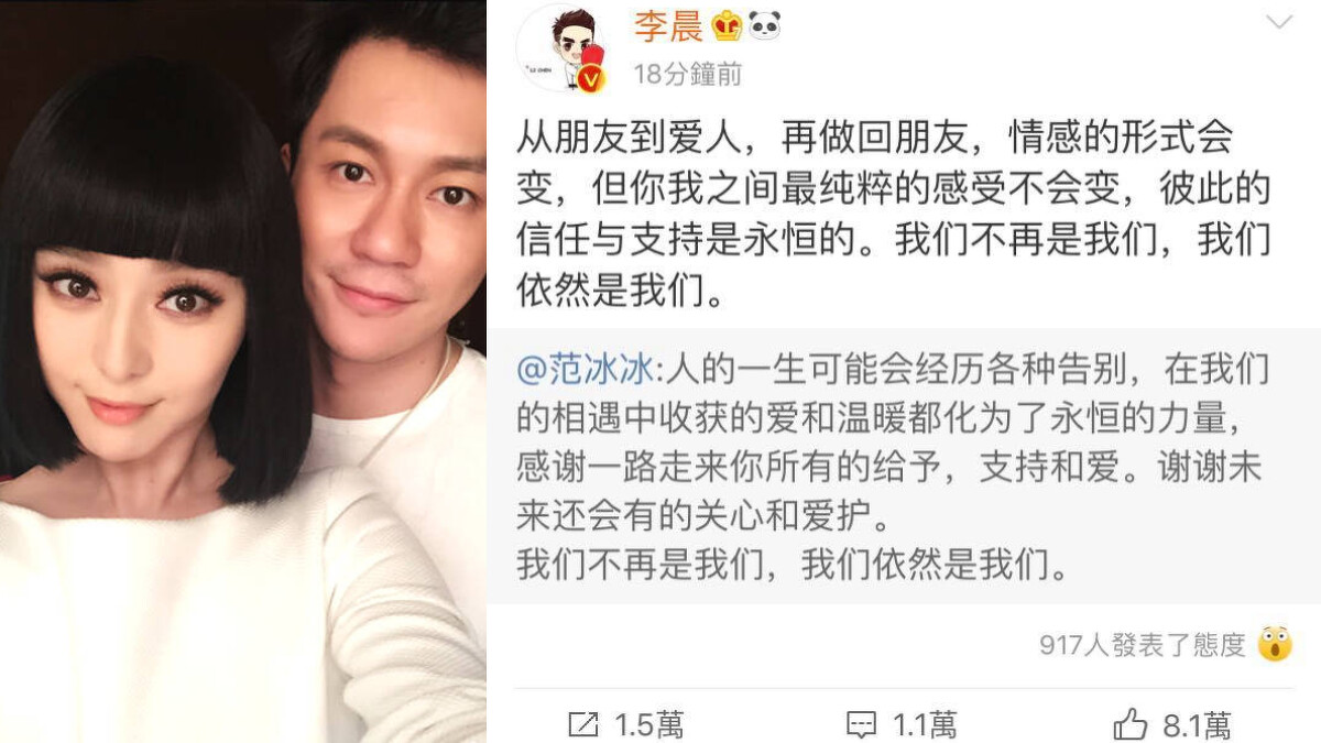 2015年交往至今,范冰冰和李晨肯定是演藝圈最受矚目的情侶檔,相差3歲的兩人自從公開戀情後,便常常大方放閃,2017年求婚成功之後,婚禮傳聞也不間斷,沒想到在宋仲基和宋慧喬驚爆離婚這一天,范冰冰最新卻在微博發文,疑似與男友李晨分手:「人的一生可能會經歷各種告別,在我們的相遇中收穫的愛和溫暖都化為了永恆的力量,感謝一路走來你所有的給予,支持和愛。謝謝未來還會有的關心和愛護。我們不再是我們,我們依然是我們。」