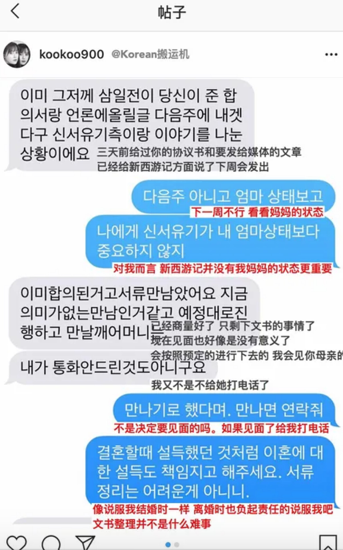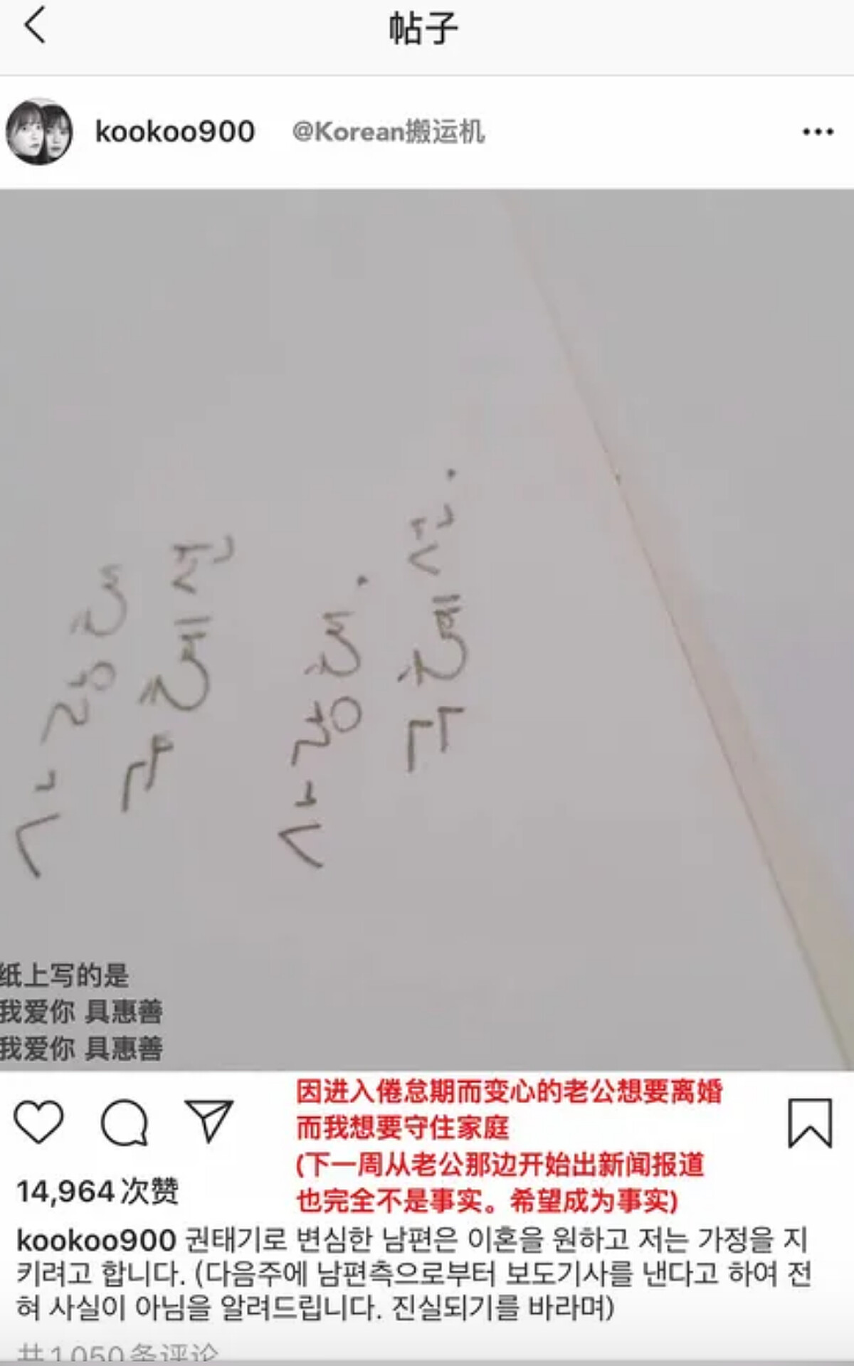 不僅如此,具惠善更公開兩人對話內容,安宰賢似乎決定先發制人,預計下週一發布新聞,不過具惠善則考慮到母親的狀況,希望能夠見面談:「像說服我結婚時一樣,離婚時也負起責任說服我吧,文書整理並不是什麼難事。」但安宰賢卻冷漠表示「現在見面已經沒有意義了」,才讓具惠善決定不要再忍,公開雙方商討離婚的對話紀錄,但隨後具惠善又把發文刪光,留下「一來一往討論離婚中,但還不是簽章或協議完成的狀態,我感到被背叛了,我想守護家庭。」