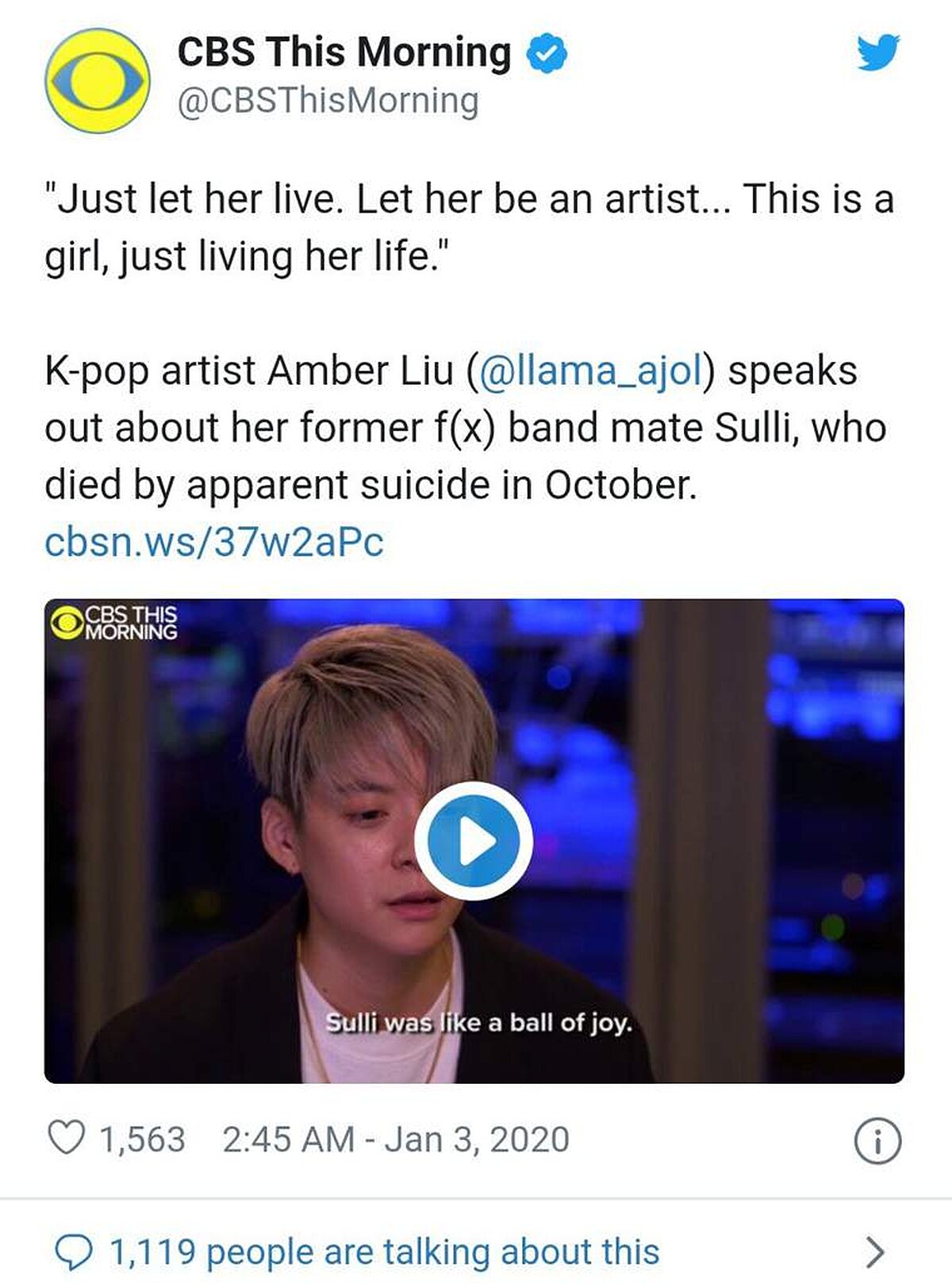 與Sulli雪莉親暱如家人的Amber,在得知她離世的消息後,第一時間對外公布自己無限期停止演藝工作,而近日心情平復後,接受了美國媒體CBS《This Morning》的專訪,專訪中Amber看來與過去開朗的狀態有些不同,談到與Sulli的過往時,幾度愁容不展。