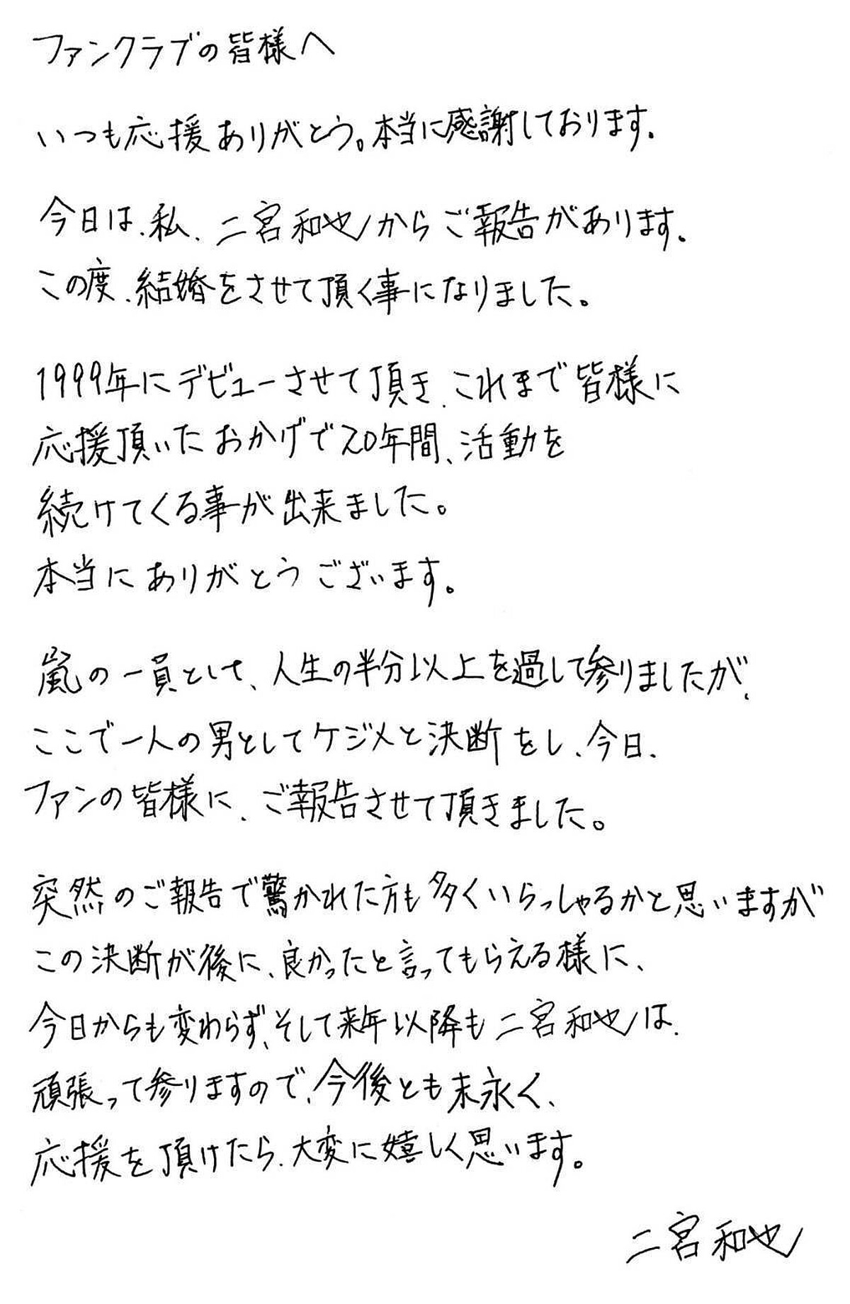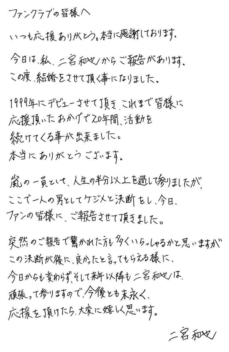 除了表示從1999年出道以來,作為嵐的成員也度過了大半的時間,感謝大家的支持,也寫下將要結婚的消息,霸氣宣告:「這是一個男人要做的決定。」也希望粉絲們得知他這個決定之後,能對自己說「太好了」這樣的回應。
