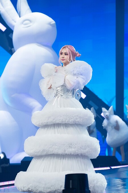 在這次以六大主題、13組華服、近40首神曲貫穿的Ugly Beauty魔幻大秀中,天后Jolin每一段表演無論是開場的暗黑系舞曲、戲劇性強烈的冶豔主打,到摩登感十足的搖滾舞台,都精準抓住歌迷的心!其中整場演出出場的道具最多、也是最具夢幻氛圍的就屬『INNOCENT MINDS純真』章節;以「純白」象徵「看見希望」做為主題去發揮,身穿童話感十足的白色蛋糕裙、裙後更巧妙以轉輪飾品點綴的Jolin宛如置身愛麗絲夢遊仙境的「童話公主」,與白色BOX新郎、雪人舞者共舞,搭配舞台上純白花園造景及大型兔子、白馬等眾多奇幻可愛的道具中反璞歸真,讓Jolin更顯甜美動人。