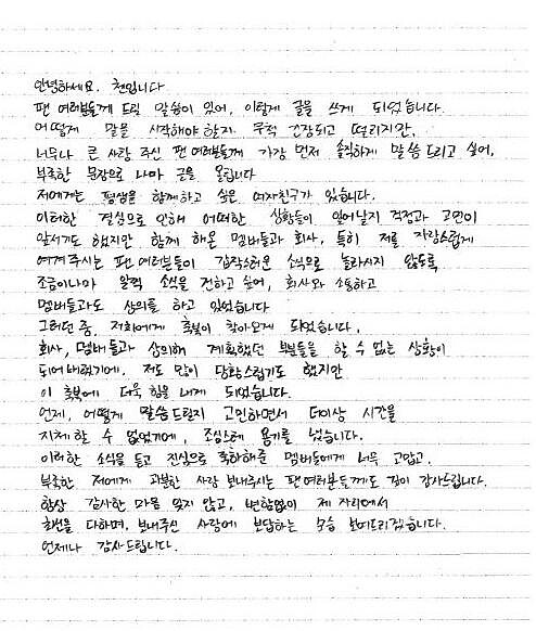 信中提到自己也很擔心公開這個決定,但希望粉絲不要太過於吃驚,因此想把這個消息早點傳遞給大家,跟公司和成員們討論之後得到了祝福:「是這份祝福給了我莫大的力量。」