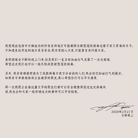 由於新冠病毒(武漢肺炎)疫情不斷擴大,尤其是中國、日本,甚至是這兩天的韓國,都陸續大爆發出新的確診案例,讓這幾個國家的人民都感到焦慮不安,而玄彬趁著《愛的迫降》的熱度,也相當溫暖地以4國語言,包含中文、日文、韓文以及英文,來表示自己的擔憂,並且祝福大家能早日從疫情的焦慮中脫困,暖男精神不在話下。