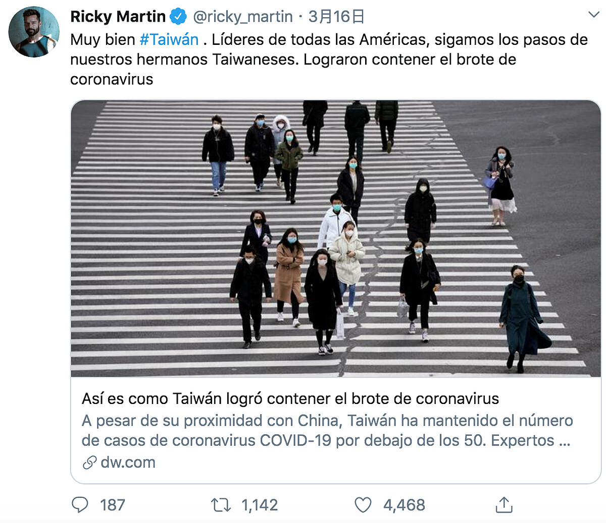 48歲的拉丁天王瑞奇馬汀Ricky Martin最新就在Twitter轉發「德國之聲」西文版網站報導台灣防疫工作的新聞,並大讚台灣的防疫工作,寫下:「台灣幹得好!所有美洲國家的領袖,讓我們跟隨台灣兄弟的腳步,他們成功地控制住了疫情。」