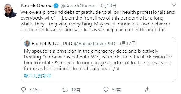 美國前總統歐巴馬(Obama)在推特寫下:「我們欠所有專業醫護人員、以及長期站在第一線對抗大流行病毒的工作人員們,一個深深的感謝。他們奉獻一切,願我們大家以他們的無私與犧牲做為榜樣,一起攜手度過難關。」