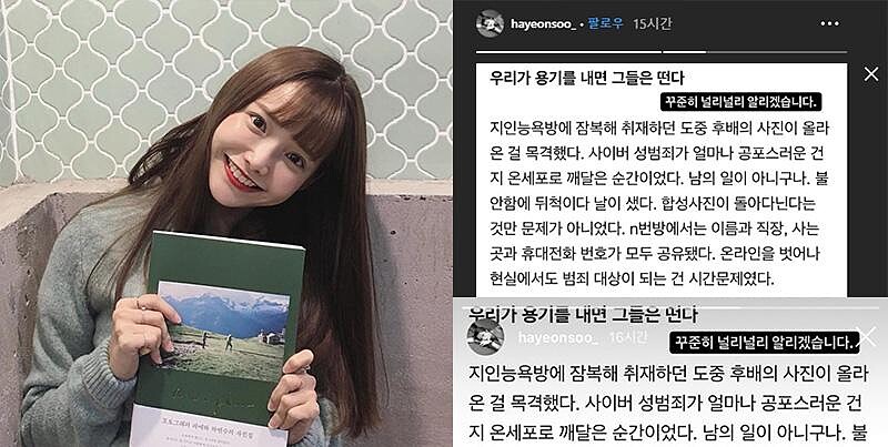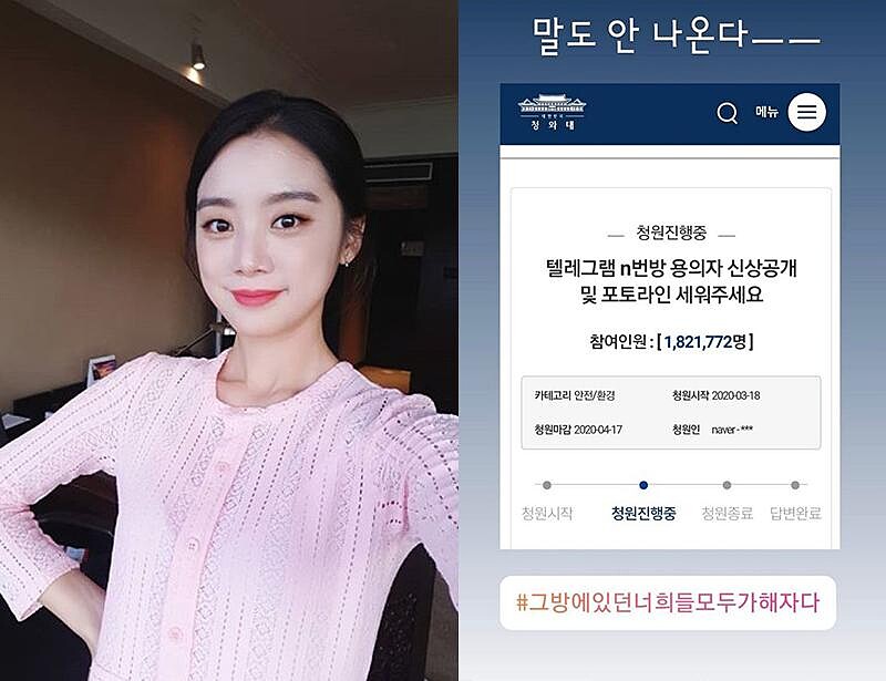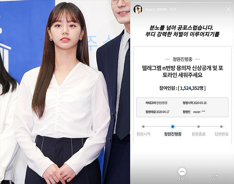 以韓劇《請回答1988》走紅的Girl’s Day成員惠利第一時間在IG上傳青瓦臺連署截圖,並寫道:「比起憤怒,更多的是恐懼,請一定要嚴懲!」