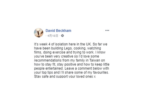 貝克漢表示希望大家留言給他一些新點子,他也會找幾個自己喜歡的和大家分享。居然連貝克漢都指定台灣,想必台灣的防疫成果貝帥也都密切在關注,各位,趕快留下你的「宅在家」不無聊方法,或許有機會得到他的回應唷!