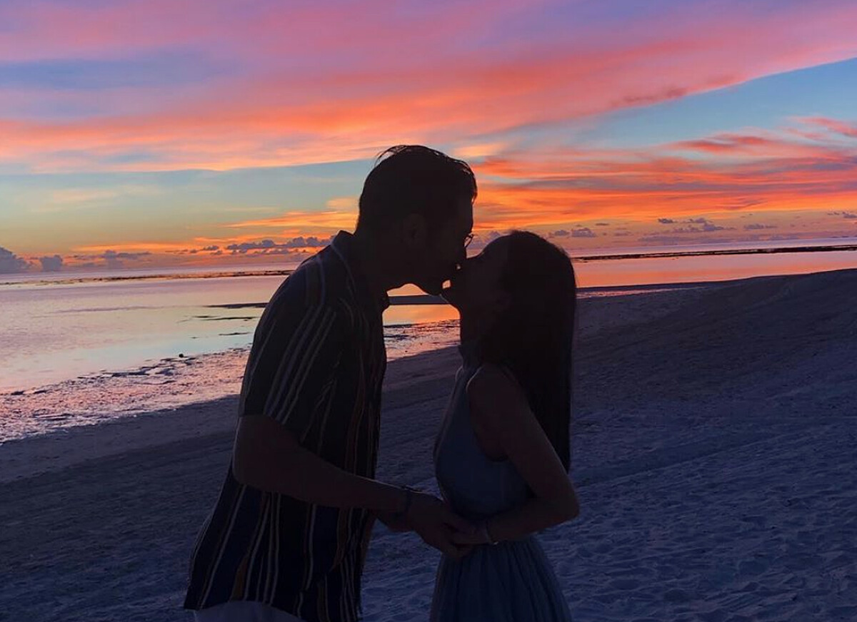 其中一張在絕美夕陽下,小倆口在沙灘上緊牽彼此的手、浪漫親吻的照片,是高以翔和Bella在2019年5月20日在巴拉望島度假的合影,還有一張是Godfrey掌鏡的情侶自拍,則是兩人首次約會的合照,也剛好是在520度過,Bella寫下:「最後一張照片,是5年前的今天,我們的第一次約會。」