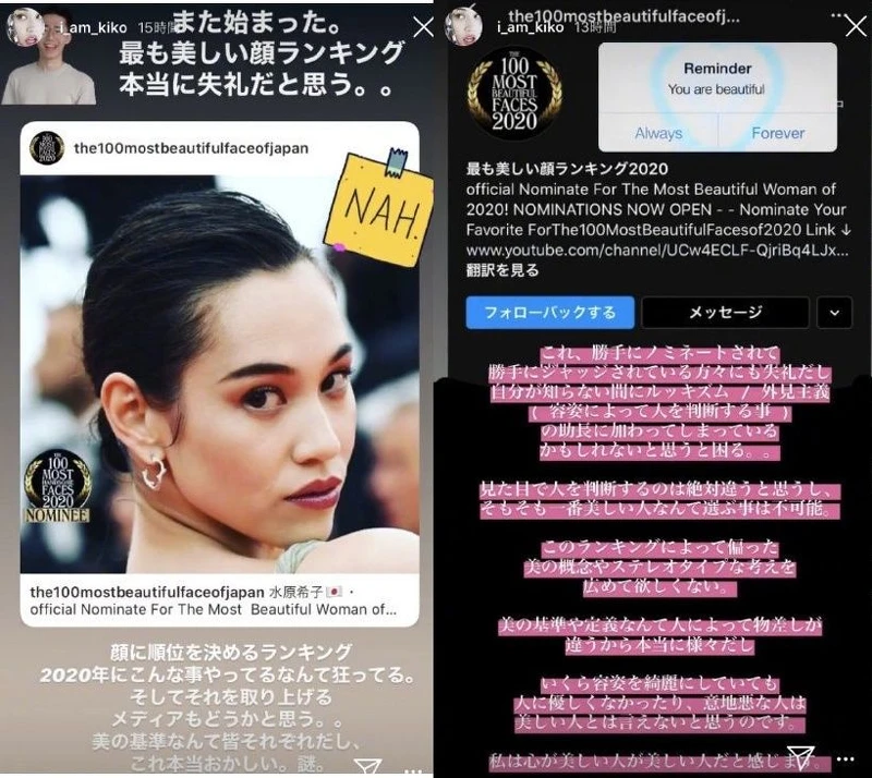 水原希子表示這種排行榜看了很討厭,她說:「我認為美應該是多樣化的,只靠一張臉去評斷是否美麗,真的很謎。」她也認為擅自決定榜單名單,還擅自評頭論足,靠外表去評斷一個人的行為相當惡劣。