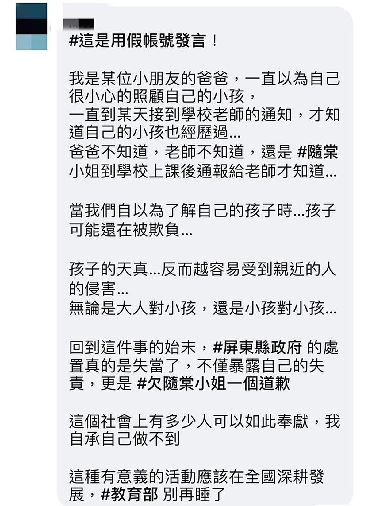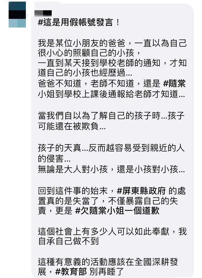 而在6月中時,隋棠在臉書貼文分享心情與遇到的相關事件,在擔任講師的幾個月裡,遇過20多位受到惡意侵害的孩子,其中一位女孩對自己勇敢講述「秘密」,讓她感到五味雜陳,和網友分享心情,並且在文末也有標註「「為保護當事人,資料經過適當修改以避免被辨識。」 貼文一出,卻引來屏東縣政府教育處的反駁,認為隋棠沒有保護當事人,並且將隋棠文章中「侵害」改成「性侵」,此聲明一出,立刻起討論,屏東縣政府教育處更認為隋棠「沒有經過事實調查就發文」實屬不當,但後來經過網友輿論後,政府機關修正了態度,轉為感謝隋棠的付出與感謝,相關人員也自請處份。成為吹哨人的隋棠,不禁思考,當這樣的意識被喚醒時,卻遭受攻擊,「相關單位間的連結、透明度、及彼此能知悉的程度是否出現了模糊地帶?政府單位的網絡連結應該都是清晰並通暢的,而非在事件真的發生後,多頭馬車的放錯焦點,打著想要確保當事人安全的名義來掩飾對這些數字及事件的訝異慌張,更造成了許多學校的壓力,以致有些我們還未完成的學校為了避開壓力,只能選擇暫時放棄我們、放棄了學生的利益,真的好遺憾。」