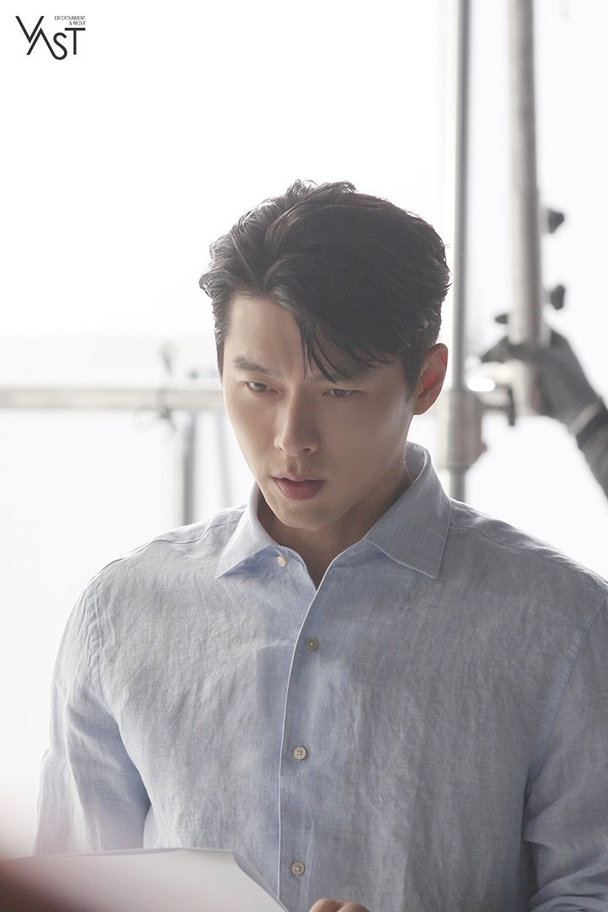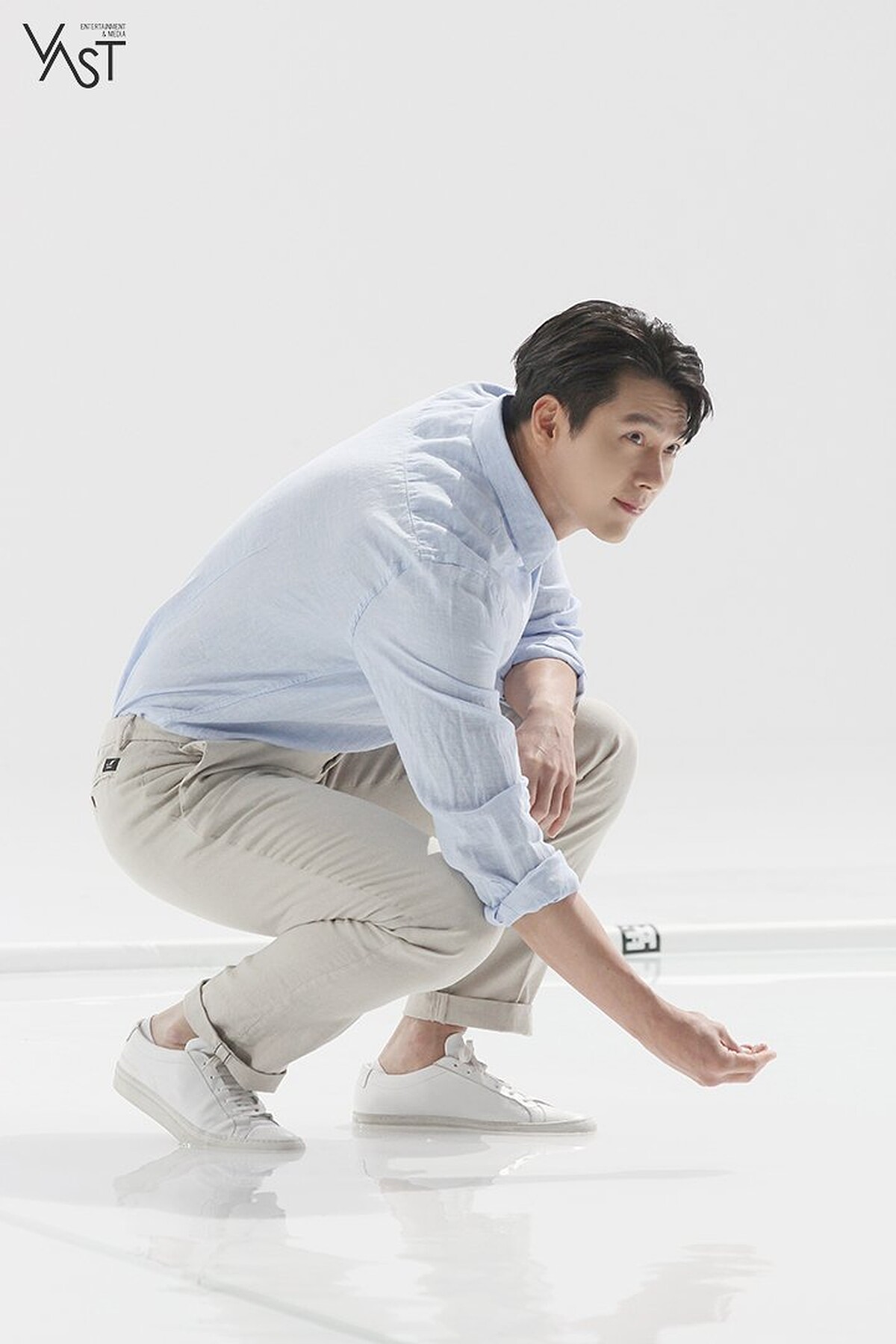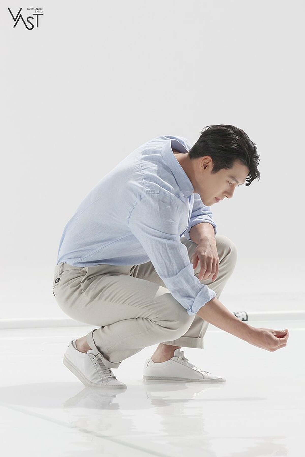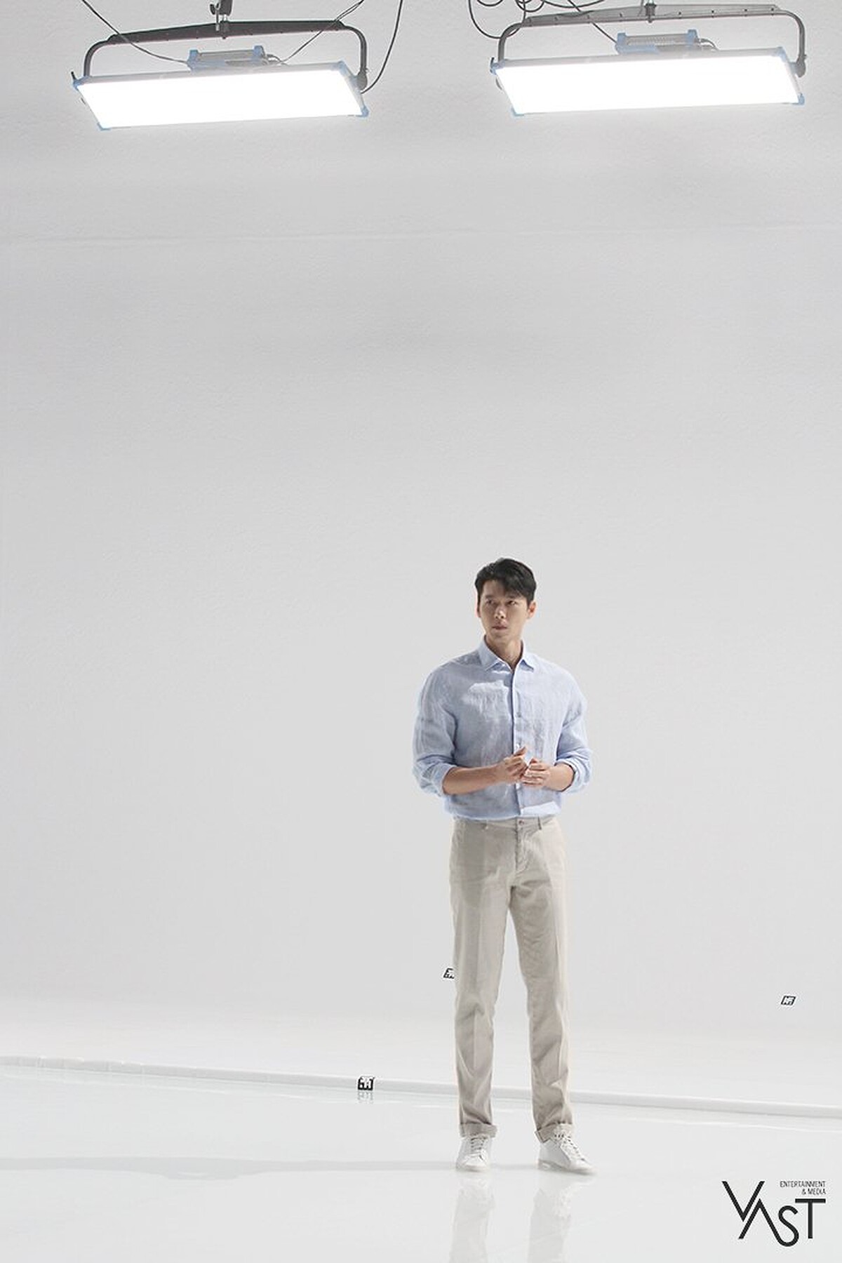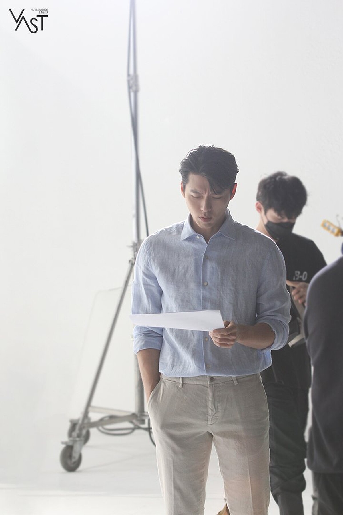 近期玄彬經紀公司寵粉釋出療癒的廣告拍攝幕後照,身穿藍色襯衫搭配卡其長褲,加上一雙夏天流行的小白鞋,完美地告訴大家什麼叫做穿搭教科書。