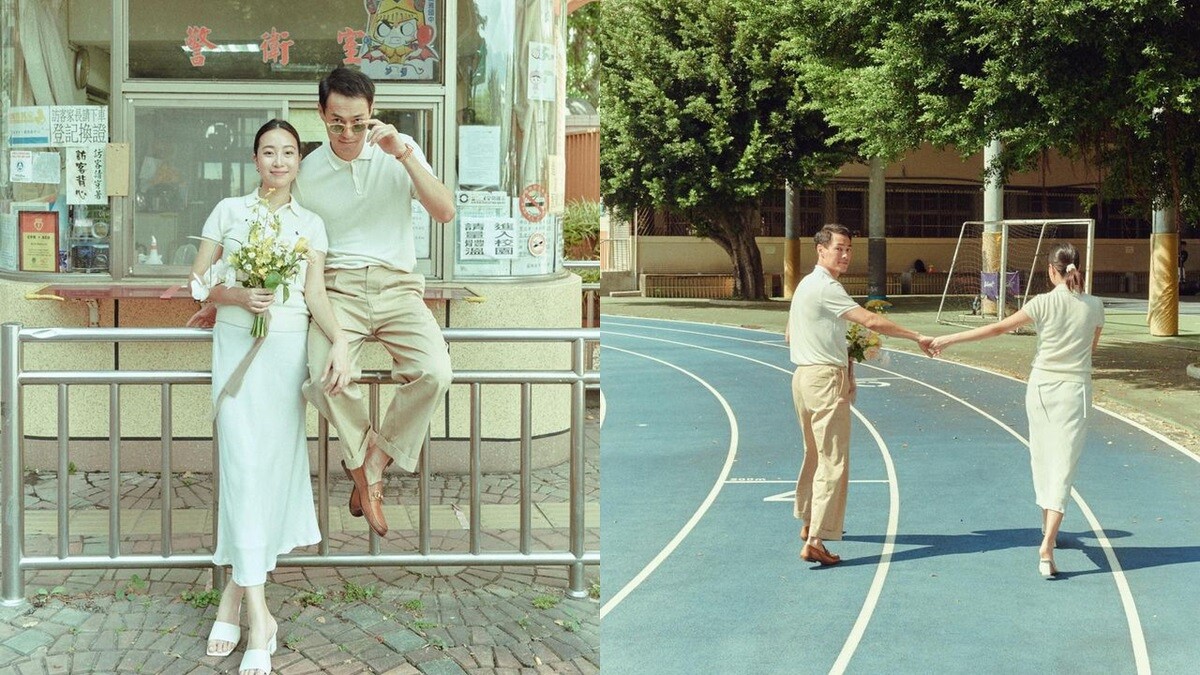 兩人這組「楊氏夫妻」大片選在校園拍攝,可以看到楊祐寧在Melinda身後輕捧孕肚,露出陽光燦笑,或是牽手走在操場跑道上,洋溢著幸福氣息,簡單自然的風格想必將會成為許多準新人的婚紗照範本呀!