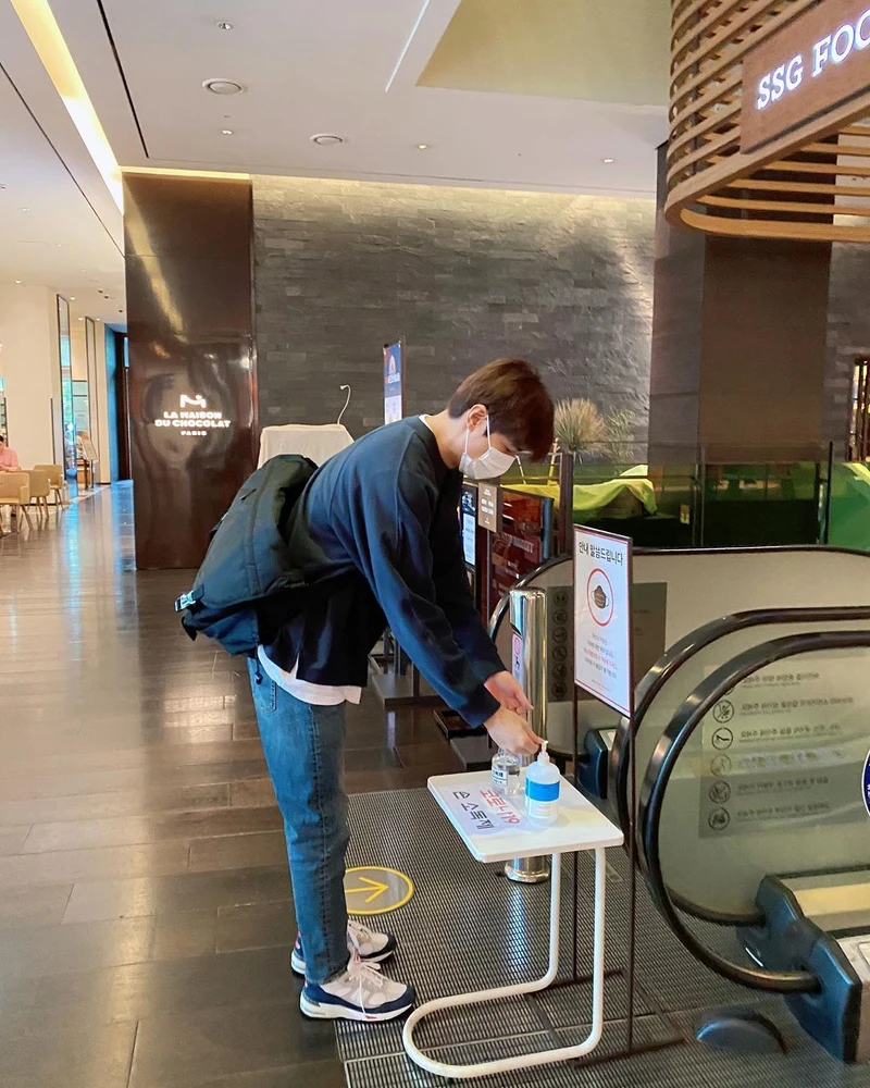 遵守防疫規定的李敏鎬,除了戴上口罩,準備進超市前乖乖地做好的手部消毒,防疫大使果然名不虛傳。
