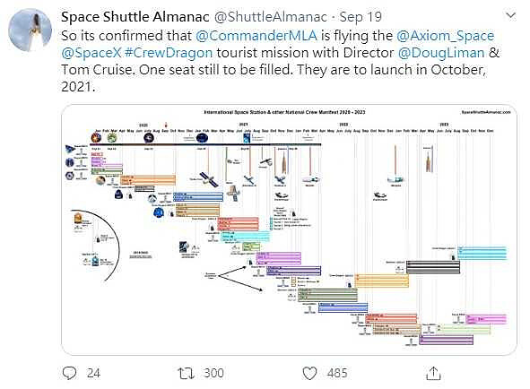 早先Space Shuttle Almanac於Twitter發布了一張圖表,上頭除了有前往國際太空站的資訊,還有著機組人員名單,沒想到名單內居然出現湯姆克魯斯以及導演道格李曼的名字。