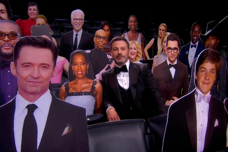 主持人 Jimmy Kimmel 獨自站在頒獎典禮的現場發表開場獨白,還搞笑地開了個諧音玩笑,說道:「歡迎來到 pandemmys!」(Pandemic疫情 + Emmy's 艾美獎) 而且現場笑聲不斷!原來是節目組剪接往年艾美獎的頒獎片段,來捧場 Jimmy 的演講。鏡頭在最後才帶到空蕩蕩的觀眾席,除了好友 Jason Bateman 特地現身以外,其餘的觀眾席都以紙板明星代替。
