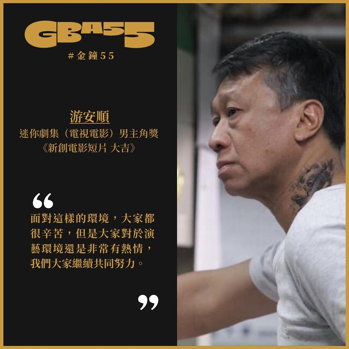 再以《新創電影短片 大吉》奪下最佳迷你劇集男主角後,游安順震驚上台:「真的太意想不到了!謝謝孝全、宏都拉斯、子儀、竹昇,謝謝你們把獎讓給我。這個我真的就沒有準備了,我不曉得該說些什麼?謝謝大家,我相信我們現在面對這樣的環境,真的大家都很辛苦,但是我相信大家對於這個演藝環境有非常的熱情,我想我們大家繼續共同努力,我們拼下去,謝謝。游弟,爸爸又拿一個啦!」
