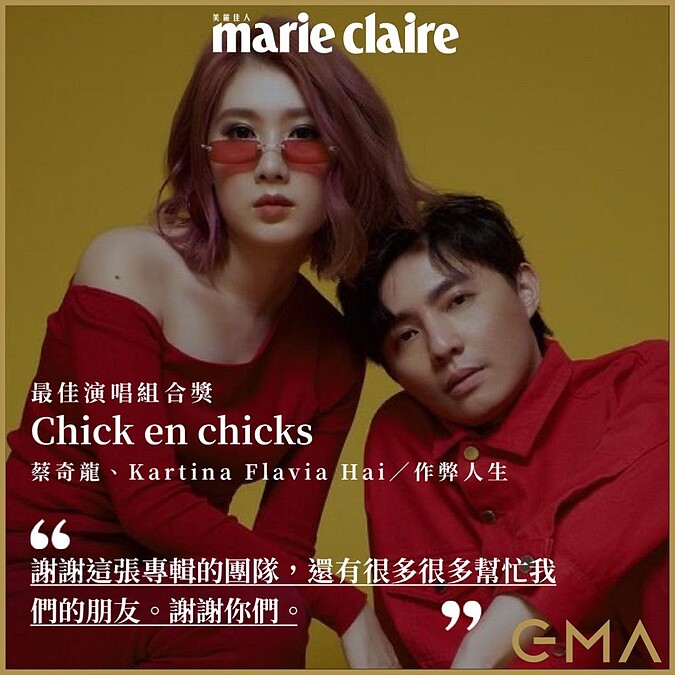 「謝謝金曲獎各位評審,謝謝文化部,我首先要謝謝這張專輯的團隊,感謝我們的混音師。如果你有在看節目,我們說不出有多感激你,你從一開始就與我們同在,不只是工作夥伴也是朋友,非常非常支持我們,我們愛你。還有專輯封面設計、導演、還有很多很多幫忙我們的朋友,還有在我們發片時幫忙我們的單位。謝謝你們。」
