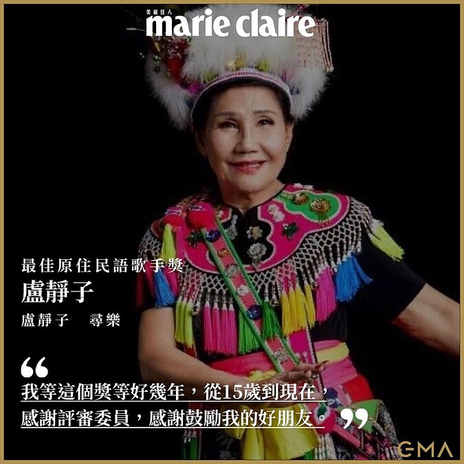 第一代阿美族歌后盧靜子上台領獎:「各位來賓大家好,我等這個獎等好幾年,從15歲到現在。評審委員肯定我會得這個獎,因為我從15歲就創作歌曲,到現在我錄了唱片有13張,我感謝評審委員,也感謝鼓勵我的好朋友,謝謝,還有我的小孩還有我老公,感謝。」
