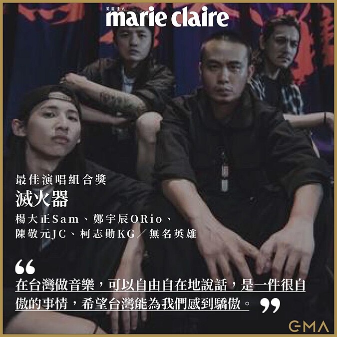 楊大正Sam:「謝謝一路支持我們的樂迷朋友,謝謝我的家人。感謝紙風車跟綠光劇團,在我最沒有勇氣的時候遇到你們,感謝你們的疼惜,做我的後盾,我才能完成這麼多的事情。謝謝火氣音樂,謝謝製作人,謝謝滅火器的團員還有歷任團員。最後謝謝謝評審。這個獎是滅火器成軍20週年最棒的生日禮物。有些時候。我在網路上看著鍵盤攻擊,也會懷疑自己,是不是像他們說的,滅火器就是一個愛扯政治,熱愛消費台灣的爛團,但是謝謝金曲獎的背書,讓他們知道這件事情絕對不是像他們說的那樣,我們可以站在這裡,是因為我們很認真在做音樂,而且做得很好。這個獎我想送給16歲的自己。我們是來自高雄的滅火器。」
