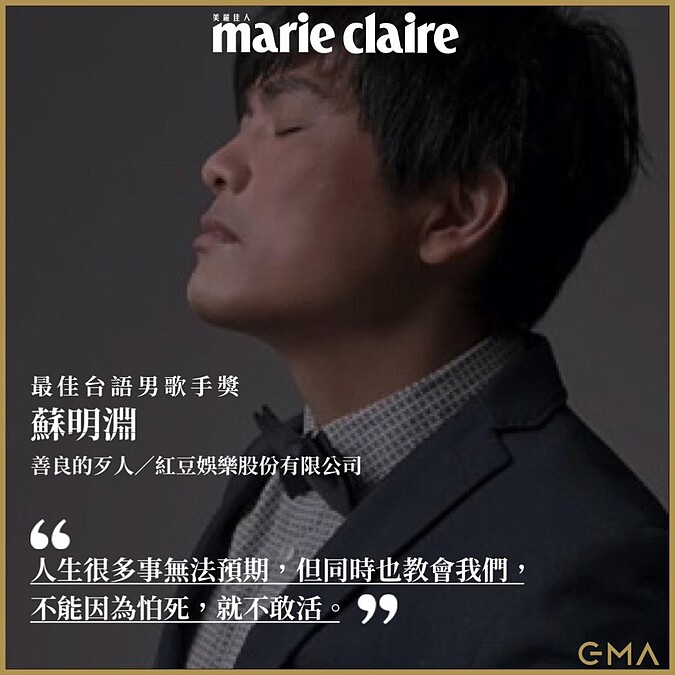 回想起一路走來的辛苦,蘇明淵落下男兒淚:「謝謝金曲獎。這個獎對於一個律師來說,是一個奢侈的榮耀,但是對一個歌手來說,是一個遲來的肯定。人生教會我們,很多事情都無法預期,但是同時也教會我們,不能因為怕死,就不敢活。30年前第一次拿著吉他上台比賽,一直走到這個地方,花了這麼長的時間。我要告訴大家,你被定位為某一個角色的時候,你還是可以勇敢地去追求,並且去灌溉你心裡面夢想的田,總有一天它會開花結果,就像現在一樣。我第一要感謝的就是我爸爸媽媽,灌溉滋養我台語的文化,讓我能夠認識台語之美,用台語創作音樂。但是很遺憾的是,我爸爸幾年前已經失智,他現在已經沒有足夠的辨識能力,能跟我分享這份榮耀,所以這個獎我要獻給他。我的太太跟孩子全心包容我、支持我,讓我沒有後顧之憂,得以兼顧律師跟歌手這兩個都很難的工作,我要感謝你們。30年前在一場比賽相遇的大鈞老師,帶著我進音樂圈,教導我,讓我能夠得到這個獎。再來就是紅豆娛樂上上下下的知遇之恩,如果沒有你們,我的音樂現在可能還躺在硬碟裡面,無法問世。我想,每個人到最後,即便到了50歲還是有追夢的權利,謝謝金曲獎。」