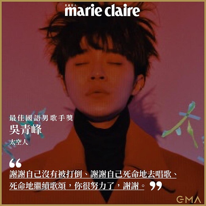 「我覺得2019對我來說是很很特別的一年,因為我重新定義自己成為一個歌手,也重新定義自己看到的善惡跟人性。我想謝謝很多人,首先是我的家人朋友以及蘇打綠的團員。謝謝參與專輯,以徐千秀為代表的所有製作的夥伴,以及陪著我一起演出的所有音樂家們。也謝謝謝陪我一起成立工作室的夥伴,特別是我十幾年的工作夥伴,因為有難同當不容易,有難同當之後可以有福同享更難。但是有福同享之後,再一起迎接更大得災難是奇蹟。我要感謝環球音樂在我像是一個等待回收的垃圾時,給我一個家,尤其是Mei,他在我完全不相信這個世界時對我說,你不想再做音樂沒關係,你不想跟任何人合作也沒關係,但請你一定不要再也不相信人就是因為這句話,我才把那個碎成一地的歌頌者,一片片撿回來,成為大家聽到的太空人,所以我想要很自私地對自己說,我要謝謝自己沒有被打倒,謝謝我自己死命地去唱歌,死命地繼續歌頌,你很努力了,謝謝。」