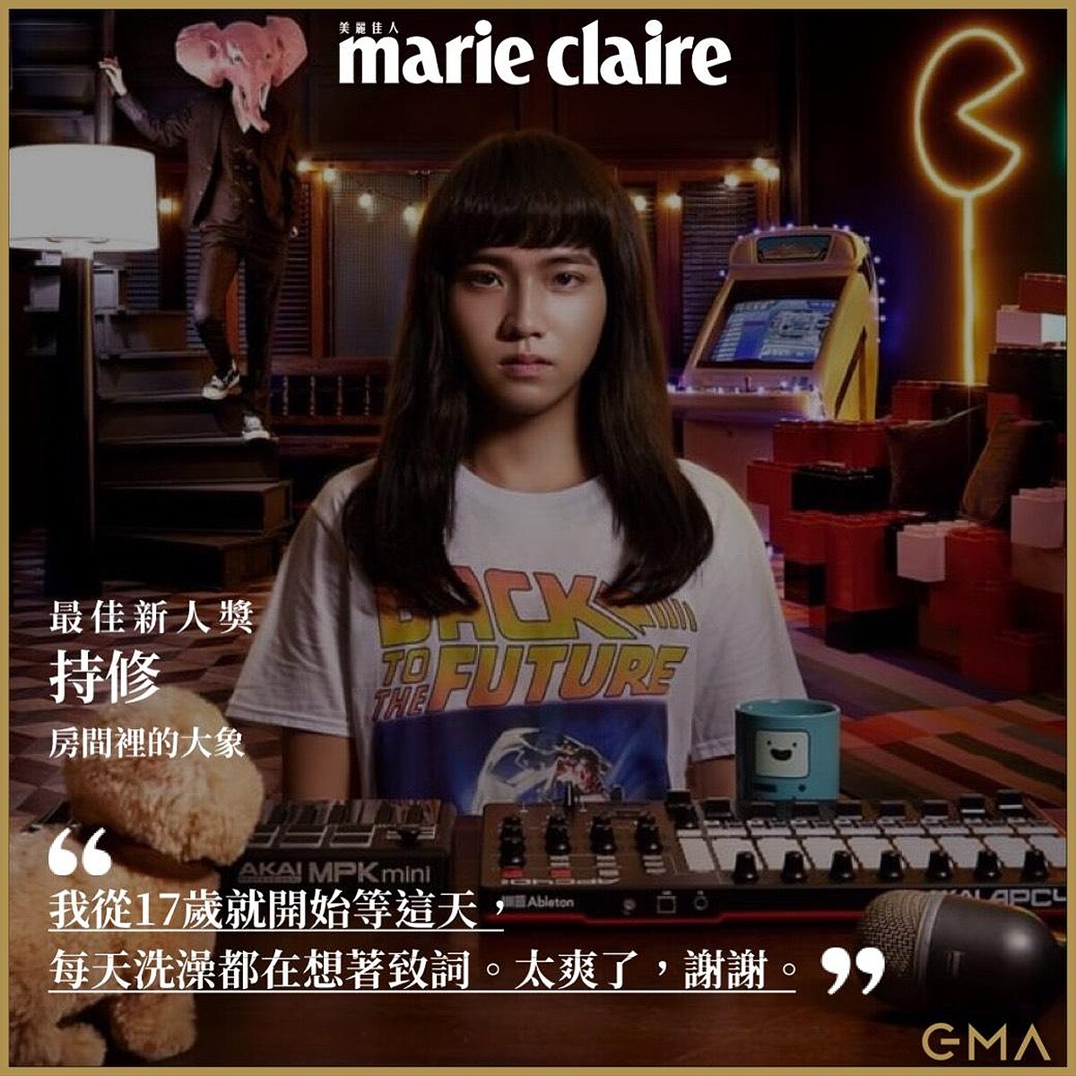 持修難掩興奮說:「倒數90秒。知足、感恩、惜福。這不是眼淚,我從來不哭的,我從17歲就開始等這天,我每天洗澡都在想著致詞。可是昨天晚上覺得好像有點太誇張了,所以還是不要講好了,剩40秒。感謝這張專輯參與的所有人,爸爸媽媽,還有小媽,我有兩個媽媽,我妹,還有我的老大張惠妹,還有另外一個老大川哥,我的經紀人,還有小宇師傅,陳君豪,還有公司的每個人,還有很多在這張專輯之前陪伴我成長的人,太爽了,謝謝。」