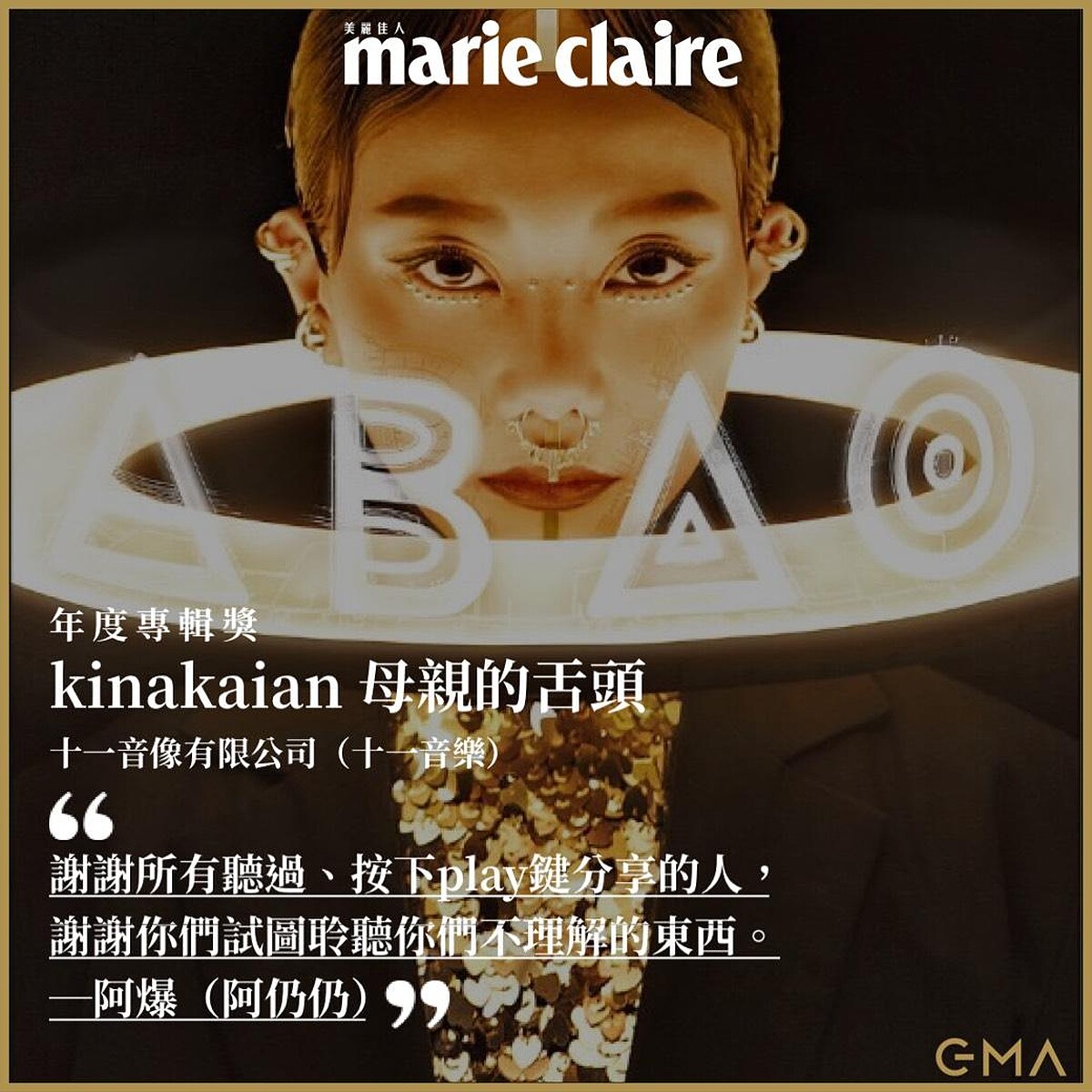 阿爆:「非常謝謝評審的肯定,在台灣其實原住民只有佔人口的2%,可能很多人不知道,其實我們是比新住民還要少的。如果你不知道的話,你看到很多河粉跟原住民碳烤豬肉的比例,你就可以知道,我們真的是認真少。那我們要用什麼樣的方式讓別人看到我們,我們有一點點藝術跟運動的天分,所以我想要告訴電視機前面所有原住民,不要浪費天賦也不要依賴天賦。謝謝所有聽過、按下play播放鍵分享的所有人,謝謝你們試圖聆聽你們不理解的東西。最後我想要告訴大家,藉由這張專輯,希望你們可以多多了解少數人的生活,不只是原住民,還有很多少數。希望在這個作品裡面,可以讓你們窺探他們的生活,不用到強迫自己熱愛,起碼可以去接觸。從聆聽的過程當中,在音樂裡面我們可以對話,希望我們能夠多一點理解,少一點誤解。真的很謝謝。如果你還不理解為什麼這張專輯會得年度專輯,請你去聽聽看。如果你還是不喜歡的話,請你聽第二次。謝謝。感謝所有至高無上的神。謝謝音樂讓我們有彼此,有機會可以聚在這裡,masalu!」
