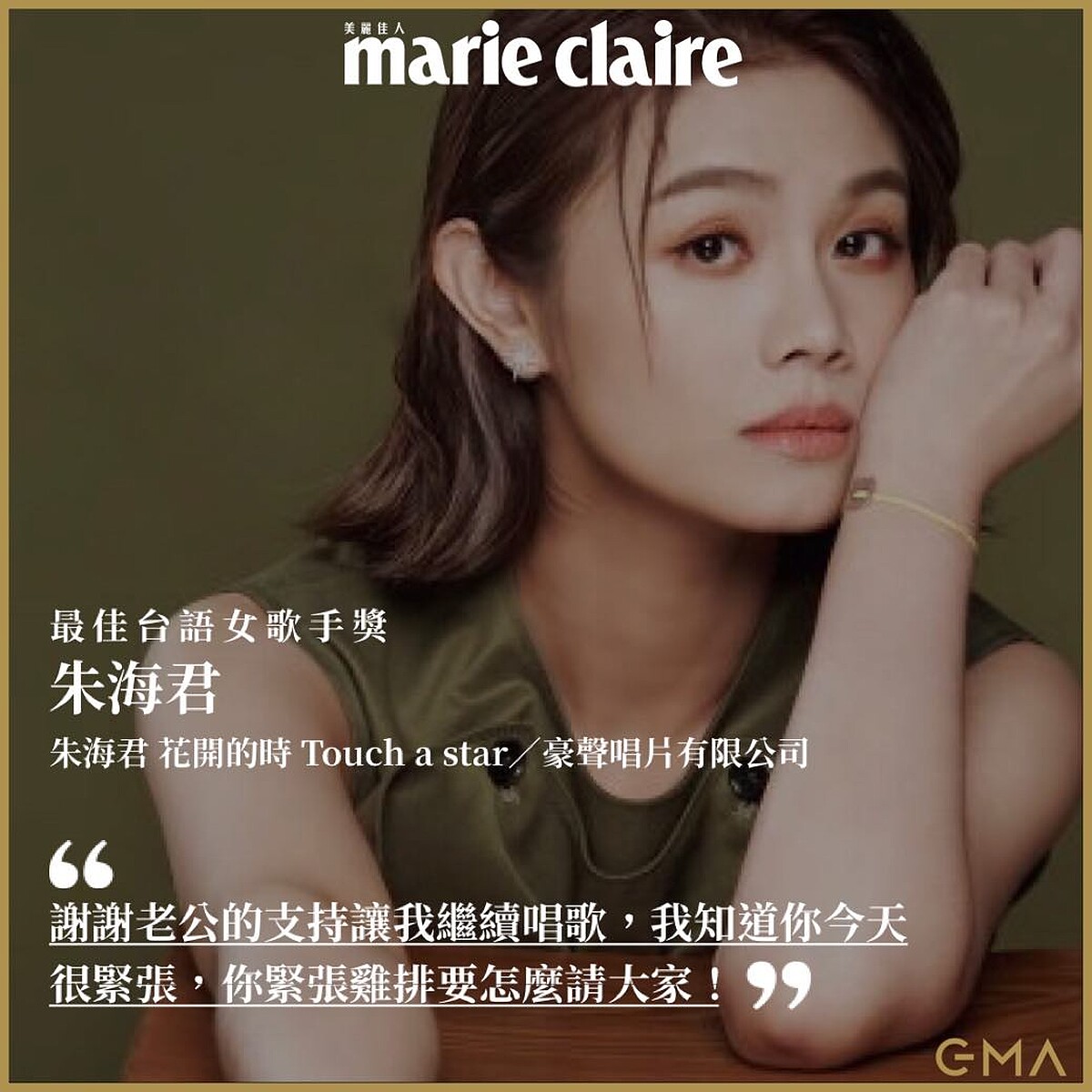 「大家好,我是朱海君。首先我要感謝金曲獎,給我這個肯定,給了我這個殊榮。我是高雄來的孩子。我雖然是一個客家人,但是我選擇唱台語,我不太會講台語,但不過我很認真在學習唱台語歌。我沒想到今天,我可以站在這個地方,拿到這個獎。我要感謝,我這張唱片的製作老師,和我一起完成這張專輯。感謝唱片公司十多年來的栽培,感謝我的爸爸媽媽,你們辛苦了。謝謝我的家人朋友們,謝謝我的歌唱啟蒙老師。謝謝我的老公No No,謝謝我的女兒,謝謝老公給我的支持與鼓勵,讓我繼續唱歌,我知道你今天很緊張,但你緊張的是你的雞排要怎麼辦?阿密陀佛、感謝濟公師父媽祖婆!謝謝我的粉絲朋友們!」