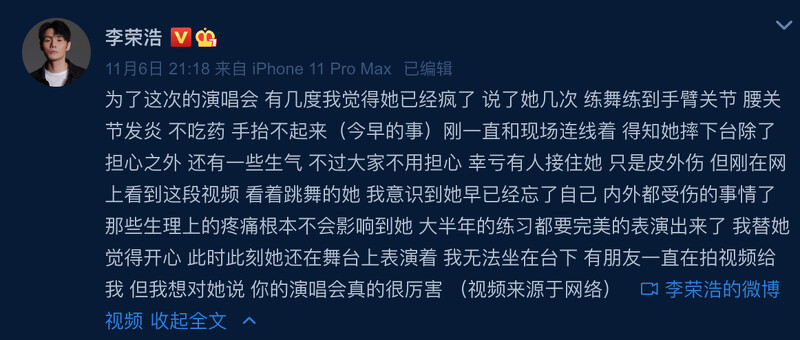 不過老公李榮浩貌似因為擔心老婆狀況而有點生氣,在微博表示:「為了這次的演唱會,有幾度我覺得她已經瘋了。」他透露楊丞琳因為練舞練到手臂關節、腰關節發炎,但卻不吃藥:「我意識到她早已經忘了自己內外都受傷的事情了,那些生理上的疼痛,根本不會影響到她大半年的練習,都要完美的表演出來了,我替她覺得開心。」