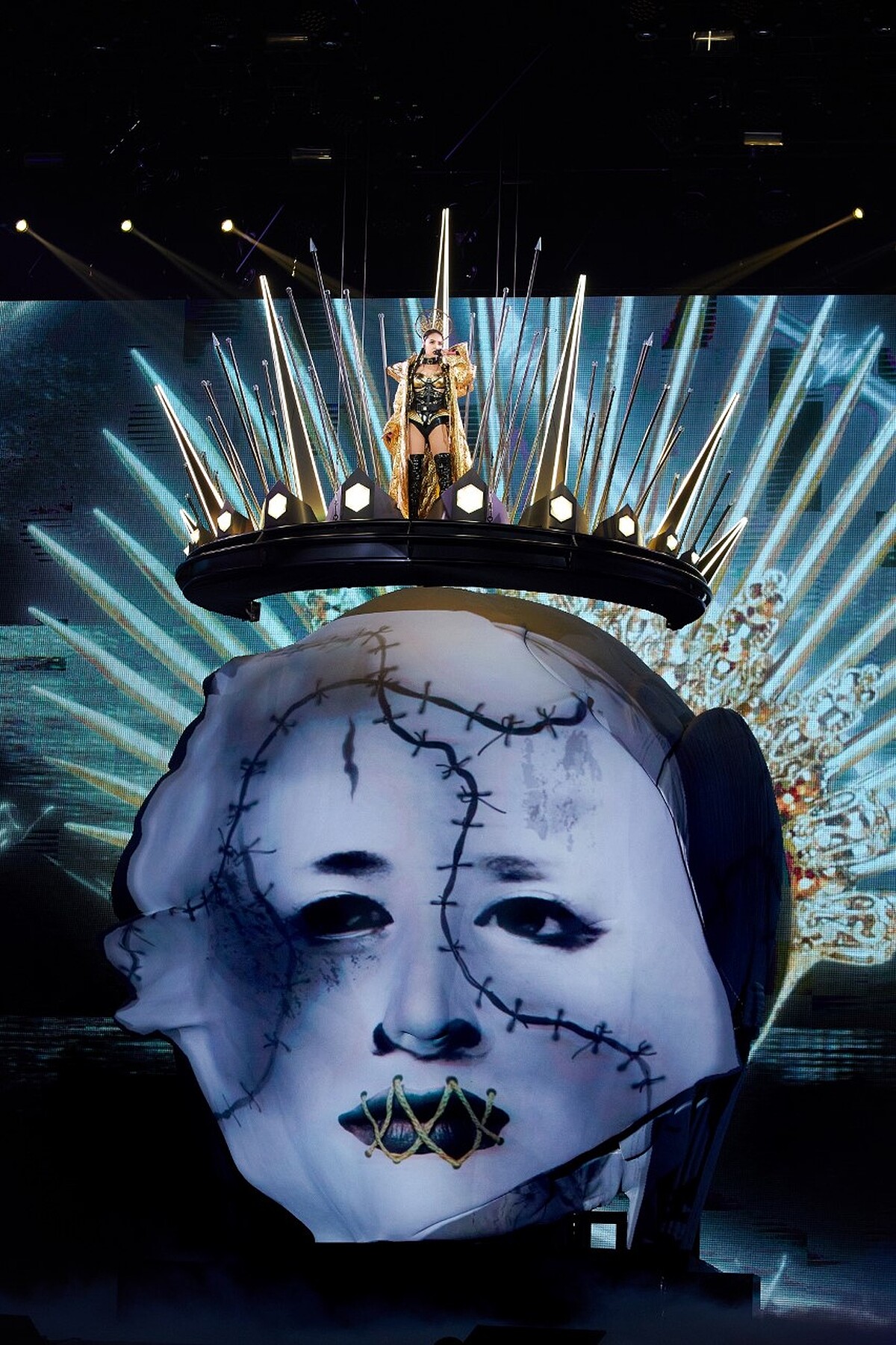 「蔡依林 Ugly Beauty 2019-2020世界巡迴演唱會」高雄站光開場就下重本,化身惡之女王的她登七層樓高「提頭」現身,這次竟在這顆「ugly beauty頭顱」動手腳,特別為它「加冕」了一個巨型「惡之皇冠」,從美國訂製並空運來台,費用約台幣600萬。