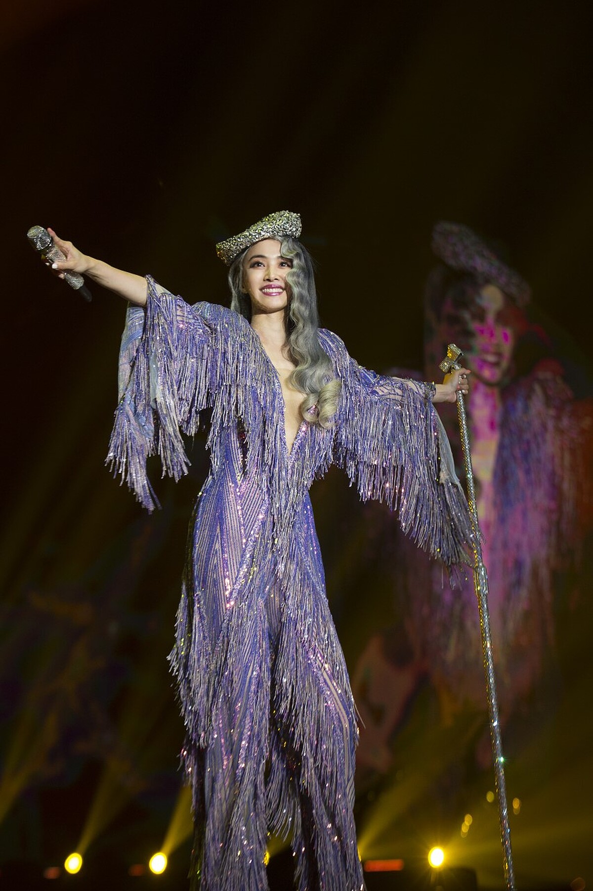 今晚共換上13套華服,其中也更新了5套前衛風格的絕美造型,包括俏麗可愛風格的「粉彩怪美芭比」、以全身銀灰色流蘇點綴的「炫目復古嬉皮風歌姬」、充滿越野賽車感「螢光越野舞伶」、前衛大膽的「藝術精靈」以及中性感十足的螢光黃綠色西裝套裝等,其中「炫目復古嬉皮風歌姬」更是開深V到肚臍眼,性感爆棚。