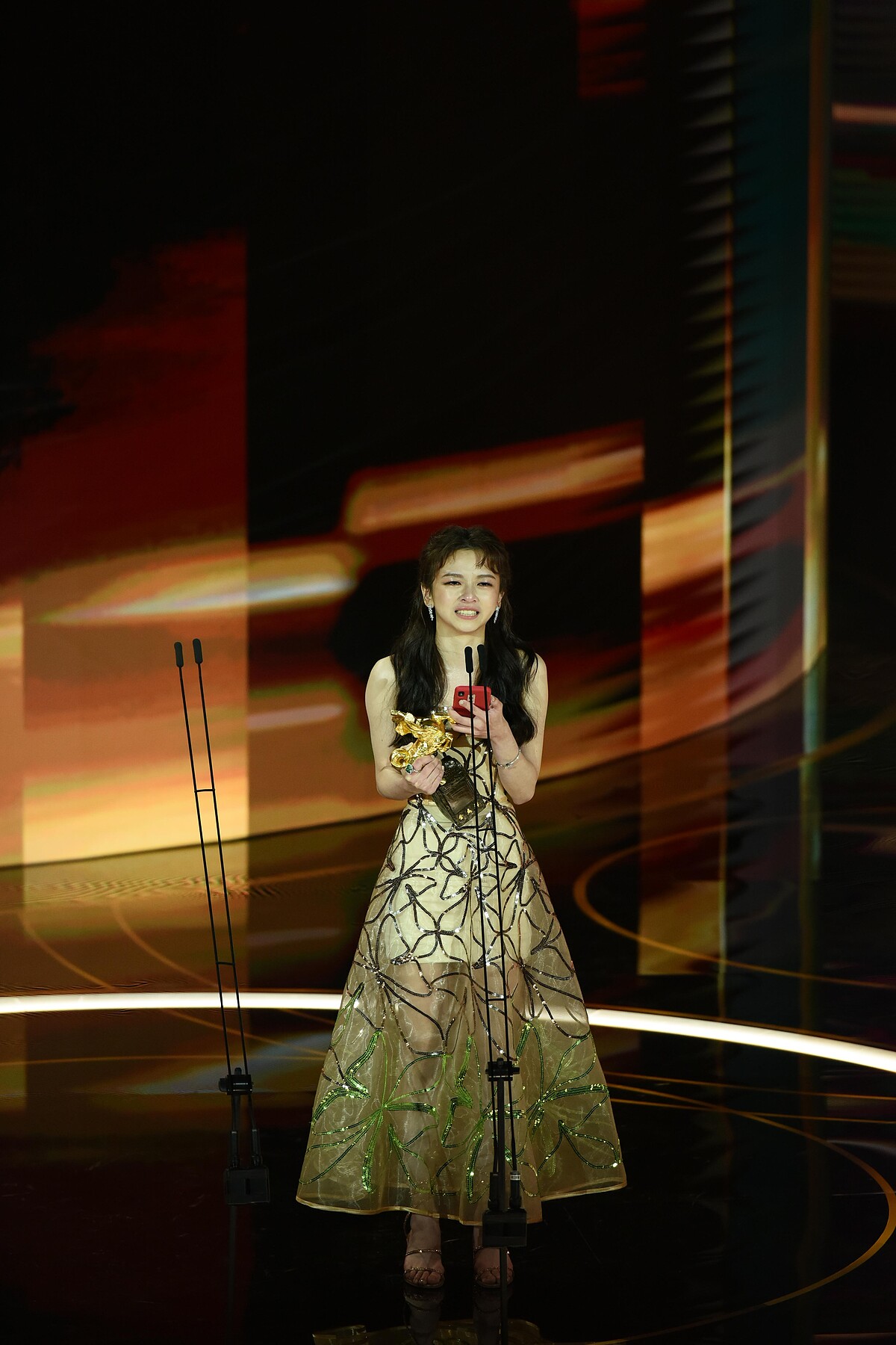 年僅20歲的陳姸霏在《無聲》中飾演姚貝貝,這回擊敗呼聲最高的陳昊森,成為金馬最強新人,宣布她得獎時也瞬間爆淚:「我剛剛被問到有沒有帶我的幸運物,我的幸運物就是我媽媽跟姊姊,她們今天有來,謝謝他們。我要先跟我的化妝師說聲抱歉,我還是哭了對不起。」