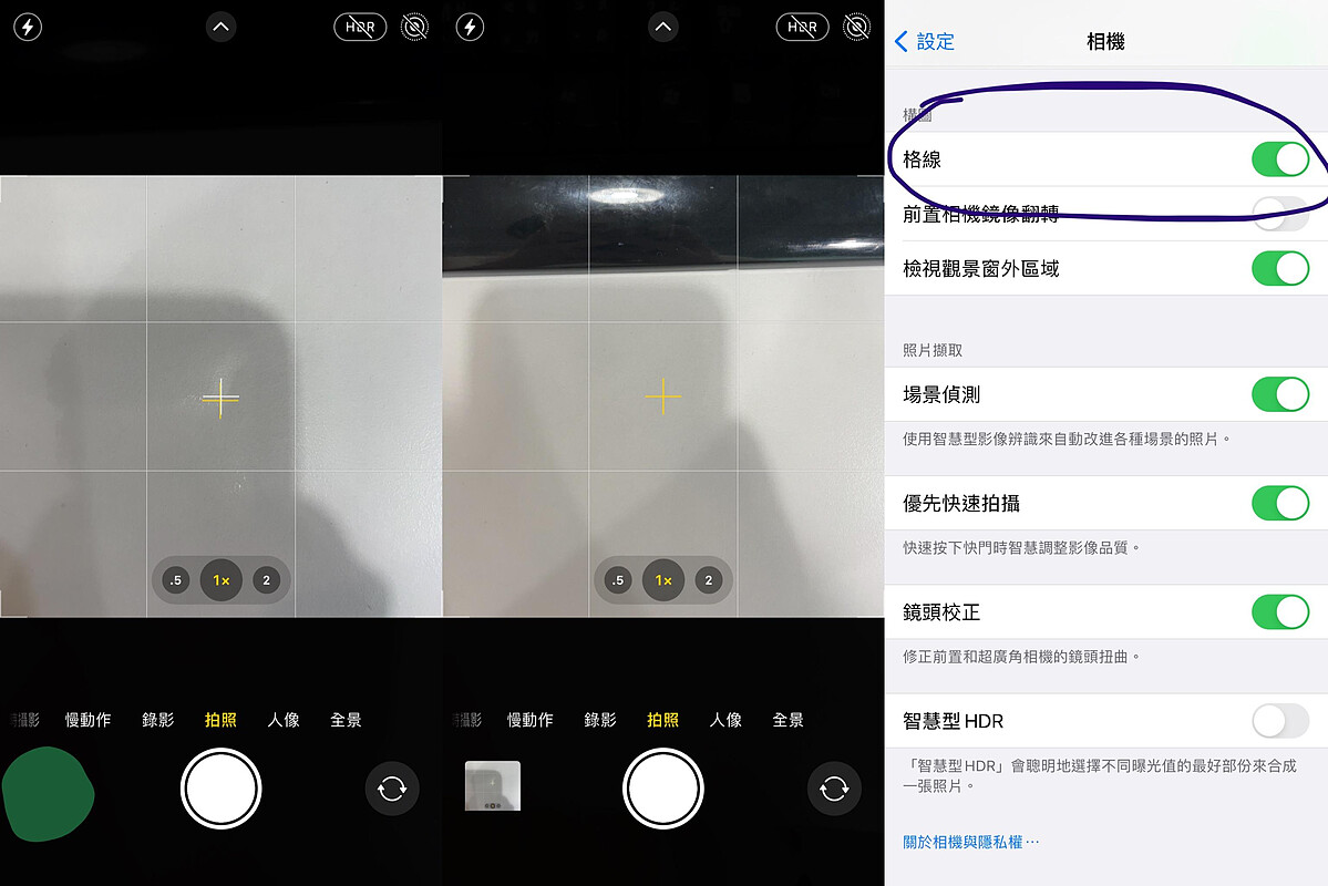 1.無論是使用iPhone或安卓系統,設定中都可以將手機相機的「格線」、「網格線」功能打開(若部分手機型號無此功能可再另下載攝影APP)