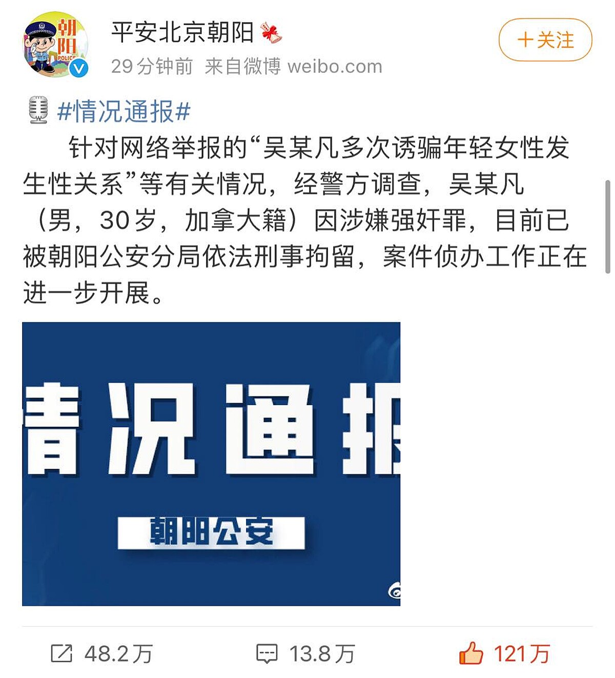 吳亦凡日前的私生活炒得沸揚,北京市公安局朝陽分局官方微博最新發出消息,網友舉報「吳某凡多次誘騙年輕女性發生性關係」等情況,進行調查後,吳亦凡(男,30歲,加拿大籍)因涉嫌強姦罪,目前已被朝陽公安分局依法刑事拘留,全案正在進一步調查中。