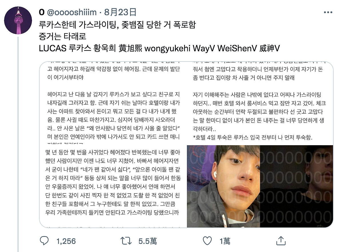 24歲的NCT成員Lucas(黃旭熙)出生於香港,是第一位在SM娛樂出道的香港人,183公分高加上帥氣臉蛋,可是許多女粉絲心中的男神,沒想到現在卻被爆出渣男行徑,有網友聲稱是曾和Lucas交往,但其實卻是被當作砲友與提款機對待,約會費用都是女方出,明明是男方說要交往,分手隔天又希望繼續當朋友,甚至還會說「妳太像粉絲了不喜歡」、「不要再做出像偶像粉絲的行為」,讓她相當受傷,感覺自己受到精神操控。