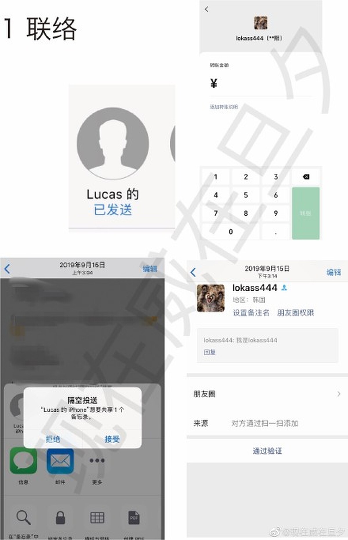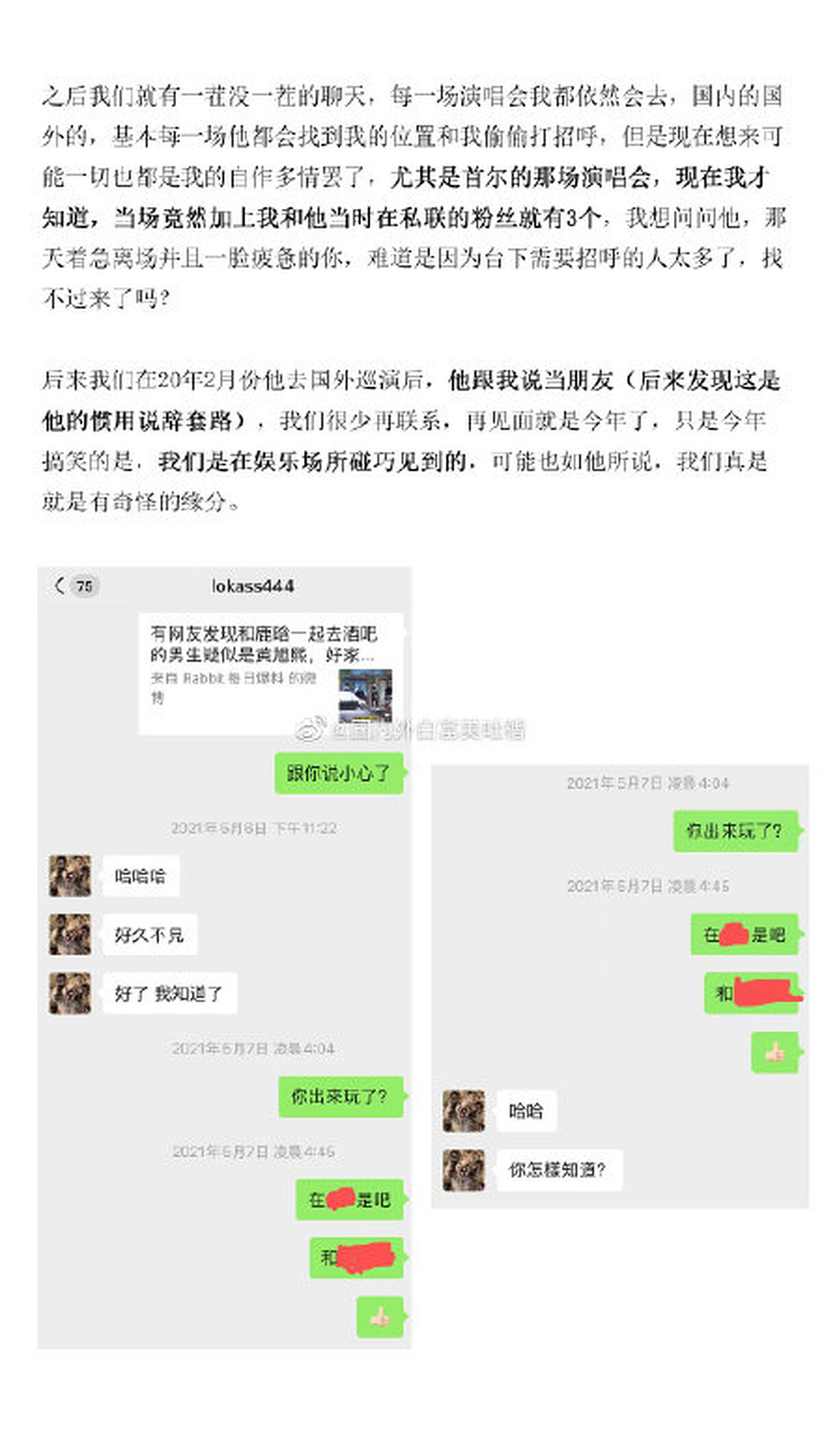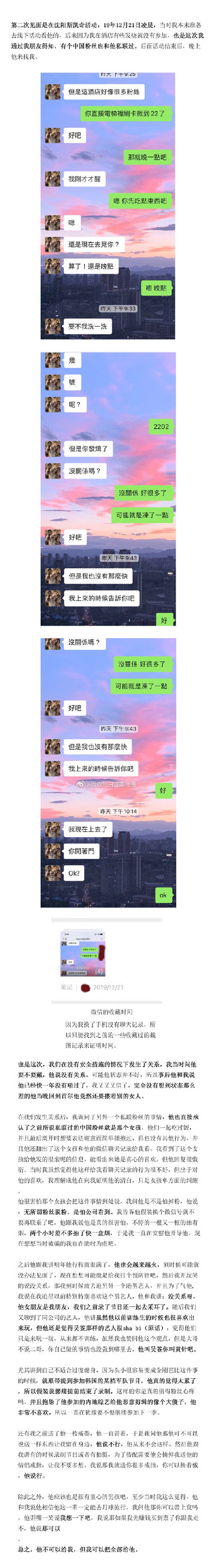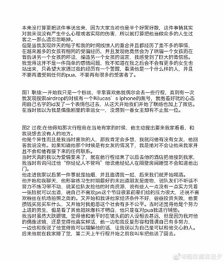 她也透露Lucas私下還曾說過吳亦凡「那樣的藝人很傻逼,覺得他們只是來玩一玩,從來都不訓練」,甚至參加韓國的軍隊節目,還因為覺得太累而謊稱腰痛提前退出。而女網友發現自己和Lucas來往的時間,和韓國網友爆料的交往時間是重疊的,與自己分開後,馬上就和女友開房。她寫下:「我原本以為他是信仰,但現在我才明白,他可能連人都不算。」