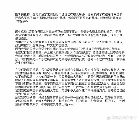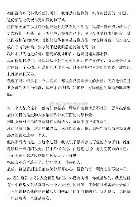 受害者可不只一位,又有中國女網友也爆料,聲稱Lucas「只是把粉絲當後宮、劈腿、私聯、把粉絲的愛隨意揮霍」,表示自己在2019年IG收到男方小號私信,和對方約在酒店見面,原本以為像是偶像劇場景發生在自己身上時,卻沒想到是走進鋪滿鮮花的陷阱,她說Lucas聲稱簽售會後只拆了她的信,並且過去只有一次私聯過粉絲,第一次見面兩人之後發生「除了啪啪其它以外的親密行為」,第二次見面則在沒有安全措施下發生關係,不過後來她卻發現,其實男方還和好幾個粉絲私聯過。